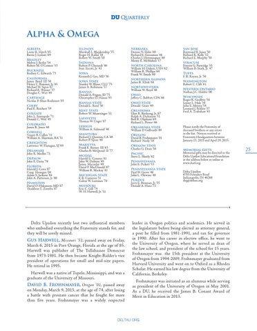 Alpha & Omega Alberta Lorne R. Hatch ’65 Barrie J. Lydiatt ’69 Bradley Melvin J. Berlin ’54 Robert M. O’Connor ’53 Bucknell Rodney C. Edwards ’73 California James Boyd III ’38 Henry C. Rimmer, Jr. ’65 Michael W. Sipos ’67 Richard E. Warner ’37 Douglas C. Witt ’49 Carthage Nicolas P. Sluss-Rodionov ’03 Colby Paul E. Reichert ’59 Colgate John L. Santopolo ’71 Donald C. Weil ’49 Colorado James R. Jones ’68 Cornell Veasey B. Cullen ’31 William A. Sharman, RA ’51 Creighton Lawrence W. Flanagan, SJ ’69 Delaware John K. Medlin ’71 DePauw John E. Davis ’78 Florida Harold J. Cates ’87 Craig Honegan ’04 Adam S. Jackson ’84 John A. Patterson, Jr. ’80 Hamilton David O. Hakanson, MD ’67 Thaddeus T. Ziemba ’87