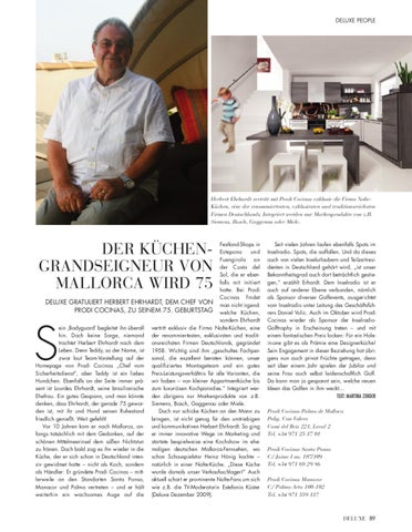 Festland-Shops in Estepona und Fuengirola an der Costa del Sol, die er ebenfalls mit initiiert hatte. Bei Prodi Cocinas findet DELUXE GRATULIERT HERBERT EHRHARDT, DEM CHEF VON man nicht irgendPRODI COCINAS, ZU SEINEM 75. GEBURTSTAG welche Küchen, sondern Ehrhardt ein ‚Bodyguard’ begleitet ihn überall vertritt exklusiv die Firma Nolte-Küchen, eine hin. Doch keine Sorge, niemand der renommiertesten, exklusivsten und tradititrachtet Herbert Ehrhardt nach dem onsreichsten Firmen Deutschlands, gegründet Leben. Denn Teddy, so der Name, ist 1958. Wichtig sind ihm „geschultes Fachperzwar laut Team-Vorstellung auf der sonal, die exzellent beraten können, unser Homepage von Prodi Cocinas „Chef vom qualifiziertes Montageteam und ein gutes Sicherheitsdienst“, aber Teddy ist ein liebes Preis-Leistungsverhältnis für alle Varianten, die Hundchen. Ebenfalls an der Seite immer prä- wir haben – von kleiner Appartmentküche bis sent ist Lourdes Ehrhardt, seine brasilianische zum luxuriösen Kochparadies.“ Integriert werEhefrau. Ein gutes Gespann, und man könnte den übrigens nur Markenprodukte von z.B. denken, dass Ehrhardt, der gerade 75 gewor- Siemens, Bosch, Gaggenau oder Miele. den ist, mit ihr und Hund seinen Ruhestand Doch nur schicke Küchen an den Mann zu friedlich genießt. Weit gefehlt! bringen, ist nicht genug für den umtriebigen Vor 10 Jahren kam er nach Mallorca, an- und kommunikativen Herbert Ehrhardt. So ging fangs tatsächlich mit dem Gedanken, auf der er immer innovative Wege im Marketing und schönen Mttelmeerinsel dem süßen Nichtstun startete bespielweise eine Kochshow im ehezu frönen. Doch bald zog es ihn wieder in die maligen deutschen Mallorca-Fernsehen, wo Küche, der er sich schon in Deutschland inten- schon Schauspielstar Heinz Hönig kochte – siv gewidmet hatte – nicht als Koch, sondern natürlich in einer Nolte-Küche. „Diese Küche als Händler: Er gründete Prodi Cocinas – mitt- wurde damals unser Verkaufsschlager!“ Auch lerweile an den Standorten Santa Ponsa, aktuell schart er prominente Nolte-Fans um sich Manacor und Palma vertreten – und er hält wie z.B. die TV-Moderatorin Estefania Küster weiterhin ein wachsames Auge auf die (Deluxe Dezember 2009).