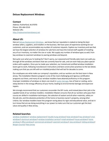 Phone: 201-464-2510 About US: Here at Deluxe Replacement Windows , we know that our reputation is staked on being the best window sellers, suppliers, and installers in the business. We have years of experience working for our customers, and can accommodate any number of customer requests. Explore our inventory and see that we have the largest selection of windows for sale here and have the trained staff capable of installing any of our inventory, no matter the size or scale. We supply any number of window types as well, from bay windows to casement windows to awning windows and beyond. Related Searches window installation| window replacement| double hung windows| bow windows| bay windows| vinyl windows| aluminum windows| window installation service| install windows| house windows| home windows| office windows| commercial windows| casement windows| new windows| sliding windows| Bergen County| New Jersey Additional Details Working Hours: Mon Fri 10am 6pm Sat 10am 3pn Payment Accepted: All cc, cash GMB Listing https://www.google.com/maps?cid=9223761483432173937
