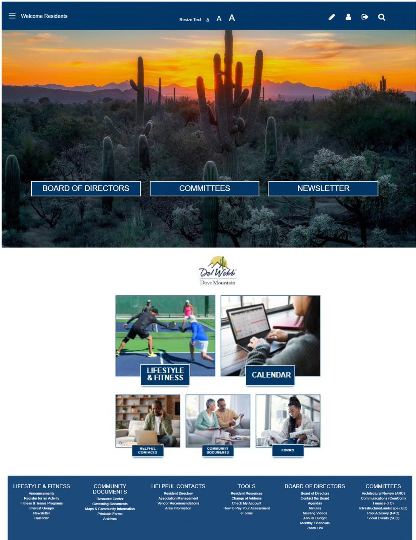 In the April 2022 Communications Survey, Residents identified a desire to improve the navigation of our Community Website (www.ourdovemountain.net). A Focus Group helped to further refine and prioritize the key elements to tackle. The “article” pictorially highlights some of the key changes to modernize our website and improve functionality. The Communications Committee hopes that these upgrades enhance your navigation/satisfaction with our website. FYI, you are able to use your current username and password.