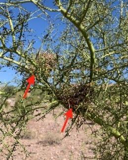 Three bird nests were observed with two from different bird species in one Palo Verde tree (Picture 2 Nests). Even after this very hot summer, quite a few ocotillo have retained their leaves, which is a great sign and when they bloom their red “torches” in the spring, the hummingbirds will be happy (picture ocotillo).