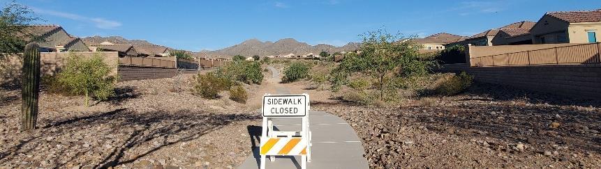 The sidewalk in the common area between Deer Creek Trail and Cliff Springs commonly referred to as the “Grand Canyon” is closed. The soil erosion under and around the sidewalk may have compromised its integrity. It has been closed based on the advice of counsel for safety reasons to prevent any accidents. Although signs have been posted, some homeowners continue to use it.