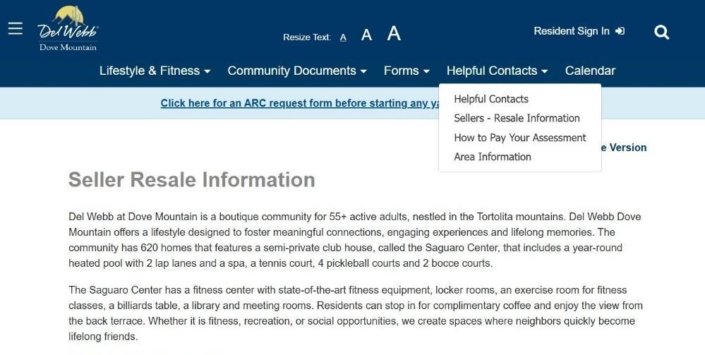 The ourdovemountain website has the information you need! No need to login to find either. Just go to Helpful Contacts>Sellers-Resale Information.
