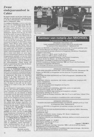 Zwaar eindejaarsaanbod in Cahier De laatste maand van het jaar wordt op muziekviak een internationale aangelegenheid, er zal dus in Hoogstraten weer veel interessanis te beluisteren vallen. Op zondag 14 december wordt de spits afgebeten door de Amerikaanse groep The Feelies (New Jersey). In 1980 zorgde hun debuutelpee 'Crazy Rhythms' voor veel persen publieksaandacht, en het werk van vier studenten werd meteen internationaal ideeëngoed. Daarna werd het stil, het bleef bij die éne schijf, tot men in 1983 besloot terug aan de slag te gaan. Wat filmmuziek en begeleiding van andere artiesten, maakten de voorbereiding uit op 'The Good Earth', in mei van dit jaar verschenen. The Feelies, momenteel bestaande uit Bill Million (zang, gitaar), Glenn Mercer (zang, gitaar), Stan Demeski (drums), Brenda Sauter (bas) en Dave Weckermann (percussie) tonen daarop een unieke stijl, erg ritmisch en ingetogen drijvend op gitaar en drums, aangevuld met zachte, bijna-mompelende vokalen. Het feit dat er tussen twee platen zes jaren liggen heeft de verwachtingen tegenover deze groep hooggespannen gemaakt, en hoe het vijftal eraan zal tegemoetkomen is op 14 december in zaal PAX te horen. Uniek konsert voor de hele regio Antwerpen, met de ZORKAS in het voorprogramma. Tickets kosten 250 frank in voorverkoop (bij Cahier De Brouillon) en 300 fr. aan de kassa. Op zondagnamiddag 21 december is het de beurt aan de Nederlandse punkgroep The Scoundrels. Dit energieke stel uit Wernhout heeft zich via kassettes, kompilatiebijdragen en talloze live-konserten een serieuze reputatie uitgebouwd. Die kreeg z'n definitieve beslag in de elpee 'Don't Cry For The Moon', waarop The Scoundrels zich ontpoppen als een rijpe, volwassen rockgroep die méér doet dan louter op wat snaren rammen. Te horen in het café van de Cahier, zondag 21-12 vanaf 15 uur, aan 'n inkom van 60 fr. En ook Frankrijk is van de partij. In het kader van een nationaal uitwisselingsprojekt tussen Vlaanderen en Noord-Frankrijk zullen in december op vele plaatsen in België rockgroepen uit het land onzer zuiderburen te zien zijn. Het projekt geniet de bescherming van het Vlaamse én Franse kultuurministerie, en wat Hoogstraten betreft werd het Rijselse trio Killer Ethyl uitgekozen. Drie gekke heren brengen opgewekte, humoristische rock 'n roll die ondertussen al te horen is op twee maxi's, 'Henri a le SIDA' en 'Killer Ethyl'. Op zaterdag 27 december in het café, inkom 100 frank. Vergeten we tenslotte ook niet het eindejaarsbal van Cahier, dit keer in zaal Cecilia in de Gelmeistraat te Hoogstraten, op 31 december (inkom gratis) en de vertoning van de ultieme muziekprent 'Stop Making Sense' van Talking Heads op 3 januari in het café, eveneens een gratis evenement. Volg naast De Hoogstraatse Maand nauwgezet radio en dagbladen, waarin meermaals 'n zwaar eindejaarsaanbod aan de orde zal zijn. En zeg nou niet dat er niks tussen zit waarop we je kunnen verwachten!