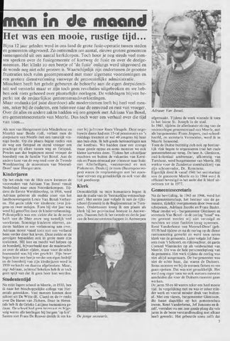 Bijna 12 jaar geleden werd in ons land de grote fusie-operatie tussen steden en gemeenten uitgevoerd. Zo ontstonden een aantal, nieuwe grotere gemeenten samengesteld uit een aantal kerkdorpen. Toch hoor je nog steeds veel mensen spreken over de fusiegemeente of kortweg de fusie en over de deelgemeenten. Het klinkt zo een beetje of 'de fusie' onlangs werd uitgevoerd en de wonde nog niet echt genezen is. Waarschijnlijk zijn ondertussen de grootste frustraties toch ruim gecompenseerd met meer algemene voorzieningen en een grotere dienstverlening vanwege de gemeentelijke administratie. Misschien heeft het gehele gebeuren de behoefte aan de eigen dorpsidentiteit wel versterkt maar er zijn toch geen revoluties uitgebroken en we hebben ook niets gehoord over plaatselijke oorlogen. De veidsiagen blijven beperkt tot de zesjaarlijkse gemeenteraadsverkiezingen. Maar ondanks (of juist daardoor) alle modernismen leeft bij heel veel mensen, zeker bij de ouderen, een heimwee naar de eenvoud en rust van vroeger. Over dit alles en andere zaken hadden wij een gesprek met Adriaan Van Boxel, ere-gemeentesecretaris van Meerle. Dus toch weer een verhaal over die tijd van toen... Als men van Hoogstraten (via Minderhout en Meerle) naar Breda rijdt, verlaat men de dorpskern van Meerle met een tamelijk vinnige bocht. Op die plaats begint rechts van de weg een fietspad en stond vroeger een prachtige rij eiken tussen weg en fietspad. Precies aan dat beginpunt stond vroeger de boerderij van de familie Van Boxel. Aan de andere kant van de weg reed voor de Tweede Wereldoorlog de stoomtram van MeerselDreef naar Hoogstraten.