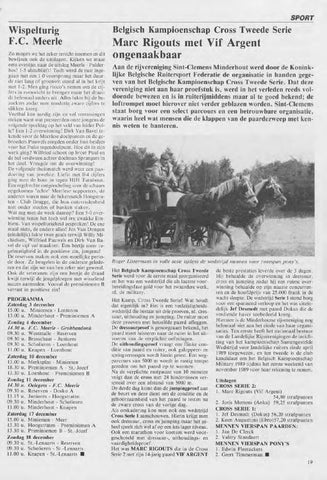 de beste prestaties leverde over de 3 dagen. Hij behaalde de overwinning in dressuur, cross en jumping zodat hij een ruime overwinning behaalde op zijn naaste concurrenten en de hoofdprijs van 25.000 frank in de wacht sleepte. De wedstrijd Serie 1 stond borg voor een spannend verloop en het was uiteindelijk Jef Desmedt met paard Dokus die de verdiende haver toebedeeld kreeg. Hiermee is de Minderhoutse rijvereniging nog helemaal niet aan het einde van haar organisaties. Ten eerste heeft het nationaal bestuur van de L.andelijke Rijverenigingen de inrichting van het kampioenschap Samengestelde Wedstrijd voor landelijke ruiters einde april 1989 toegewezen, en ten tweede is de club kandidaat om het Belgisch Kampioenschap Military 1989 tijdens het eerste weekend van november 1989 voor haar rekening te nemen. Uitslagen CROSS SERIE 2: Marc Rigouts (Vif Argent) 54,80 strafpunten Joris Mertens (Anka) 59,25 strafpunten CROSS SERIE 1: Jef Desmedt (Dokus) 56,20 strafpunten Koen Augustijns (Ebro)57,20 strafpunten MENNEN VIERSPAN PAARDEN: Jan De Clerck Valery Standaert MENNEN VIERSPAN PONY'S Edwin Fleerackers Geert Timmerman.• 19