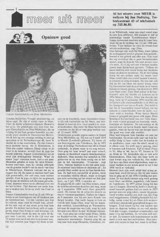 Al het nieuws over MEER is welkom bij Jan Dufraing, Terbeeksestraat 43 of telefonisch op 315.86.80. Ie en Willebroek, waar een orgel stond waar hij niet kon afblijven. Hij draaide er zelf de toenmalige topper 'Korenbloemen blauw'. Langs Antwerpen tenslotte ging hij naar huis, waar hij op de middag van 12juni 1940 aankwam. Toen hielden we voor de tweede keer wittebroodsweken, zegt Dien. Gust hernam zijn werk bij Maes, want tijdens de oorlogsjaren werd er gewoon doorgewerkt, hoewel er een gebrek aan alles was. Gust vond het erg vervelend dat er geen binnenbanden waren, want hij kon de fiets niet missen voor z'n werk. Zo is hij ooit met 4 buiten banden opeen naar Kalmthout gereden. Tijdens die jaren hield hij zich vooral bezig met mijnhout (mast en den) en houtskool. Na de bevrijding kreeg hij een andere taak: hij moest voor Maes rondrijden om overal bossen te meten, te schatten en soms te kopen. Hij was dan ook blij dat hij van Maes een motor kreeg, want hij doorkruiste heel de provincie en er waren bomen en bossen genoeg. Dat duurde tot 1953 toen Maes stierf. Gust bleef echter in de houthandel: eerst bij Stobbe uit Lokeren en in 1954 Maurice Verbist. Maar dat duurde niet lang, want op 15 september 1954 vond hij zijn definitieve job: domeinarbeider in de Hees op het landgoed van baron Bracht. Dat hield in dat hij de boswachter moest helpen om het domein te onderhouden voor de jacht, o.a. door wild te kweken. Want baron Bracht kwam er geregeld met groot volk jagen. Prins Bernhard bijvoorbeeld was een vaste klant. Er werd vooral gejaagd op houtsnip, reeën, konijnen en fazanten. De ontvoering en de moord later op baron Bracht heeft Gust erg gepakt, want de baron was een integer mens die goed was voor zijn werklui. Dien had intussen haar handen vol aan het huishouden. De eerste acht jaar van hun huwelijk hielp zij haar vader met de koeien en de aardbeien, maar toen die stierf, stond zij er alleen voor. En werk was er genoeg, want er kwamen ook kinderen. Vijf in totaal: Frans in '41, May in '44, Jan in '47, Jeanne in '51 en Hilda in '54. Inmiddels zijn er ook acht kleinkinderen. Dien had dus haar werk en daar kwam nog een verhuis bij. Het ouderlijk huis van Dien werd afgebroken, want ernaast hadden ze een nieuw gezet en op 1 mei 1956 werd er verhuisd. Hoewel Gust zijn werk altijd heel graag gedaan had, werd hij het op zijn 62 jaar ineens beu en ging op 31juli1976 vrijwillig met pensioen. Er was thuis immers nog werk genoeg voor Gust: aardbeien, augurken, rode bessen en frambozen. In 1977 echter kreeg hij last van z'n longen. Hoewel hij heel z'n leven gezond boswerk gedaan had en reeds in 1957 gestopt was met pijp roken, moest hij geopereerd worden waarbij een stuk van zijn long werd weggenomen. Gelukkig herstelde hij volledig, zodat zowel hij als Dien zich momenteel in een uitstekende gezondheid mogen verheugen. Toch moest hij het wat kalmer aan doen en daarom hebben ze nu veel minder fruit dan vroeger, waardoor ze natuurlijk veel meer vrije tijd hebben. Ze vervelen zich echter niet. Ze noemen zich buitenmensen en dat merk je ook aan hun activiteiten. Dien amuseert zich vooral in haar hof, waar zij de bloe-