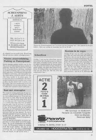 Kast met stratenplan Wie vanuit de richting Merksplas Wortel binnenkomt, moet (als hij tenminste met de auto is), zijn snelheid matigen tot 50 km per uur; dat wisten we reeds. Maar hij kan dan bij de frituur van Julia een groot nieuw bord, of liever een kast van ruim 2 meter hoog en bijna 1 ½ m breed zien staan, aan voor- en achterkant met glas. Aan de voorkant is 'n plattegrond van groot-Hoogstraten met stratenplan te zien, op de bovenste helft; op de onderste helft staan zo'n 28 bedrijven die in Hoogstraten gevestigd zijn en die werk verschaffen aan een groot deel van onze mensen. Zo zijn er 10 kasten geplaatst in heel de gemeente, deels betaald door de gemeente, deels door de 'Werkgroep Industrie Kanton Hoogstraten', afgekort WIKAHO. Voor mij had het stratenplan iets groter mogen zijn; 2/3 of twee-derde van de hele oppervlakte. Nu zijn de straatnamen erg moeilijk te lezen. De firmanamen hadden het onderste derde deel mogen beslaan: dan zijn ze nog heel goed te lezen. Het glas is veiligheidsglas van 8 mm dik, en is vandalisme-bestendig. Laat ons hopen, de tijd zal het leren.L1
