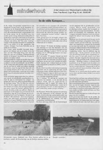 In de stille Kempen.. In de vorige Hoogstraatse maand kon u een uitgebreid verslag lezen van de algemene ver gadering van de dorpsraad. Helaas was ik iets vergeten. Een van onze dorpsbewoners die zich, zoals elk weldenkend mens, zorgen maakt over het beetje natuur dat de mensheid nog rest, merkte op dat er langs alle kanten stukken bos of houtkanten verdwijnen. Met name op Bergen en Mariaveld is dit de laatste jaren het geval. Aan schepen van milieu. Jef Van Looy, werd gevraagd of dit eigenlijk allemaal wel wettelijk in orde is en zoniet of er dan opgetreden kan worden. Schepen Van Looy beloofde een en ander na te trekken. Op 9 maart sprak dezelfde bezorgde dorpsgenoot uw dienaar aan om te laten weten dat men aan het Paterspad bezig was met het afgraven van een zavellaag. Ondergetekende haalde de fotograaf-van-wacht op, en ging ter plaatse een kijkje nemen. We parkeerden de wagen op de plek waar onze fotograaf vorige zomer ging staan om een foto te maken voor de fietszoektocht van de KWB. Of de werken die daar gaande waren strookten met de wet kon ik vanop deze plaats moeilijk beoordelen, maar ik mag het hoe dan ook wel zeer spijtig noemen dat er weer een oase, een plekje om te picknicken, verdwijnt en er straks alleen nog een monotone groene woestijn overblijft. Toch een beetje aangeslagen door het schouwspel van de onverbiddelijke graafmachines besloot ik eens te informeren bij schepen van milieu, Jef Van Looy, of hij nog gedacht had aan die bewuste vraag. "Hoe het daar nu concreet Zit kan ik niet zeggen maar wel dat, wanneer men bomen wil vellen, men een kapvergunning aan moet vragen bij A,ninal, afdeling Bos en Groen, die deze al dan niet aflevert. Indien de aanvrager na 60 dagen nog geen bericht heeft ontvangen, mag hij ervan uitgaan dat hij toestemming heeft voor het kappen. Na zijn er op de dienst "Bos en Groen ", door een vergissing, nogal wat aanvragen onverwerkt gebleven waardoor er waarschijnlijk heel wat onterechte kappin gen zijn gebeurd. Dit is ,nen nu volop aan