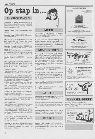 Zondag 4april: PAS EN, eieren zoeken, rapen en eten. Zaterdag 10april: HEROPENING Recreatiedomein De Mosten. Maandag 12 april : JAZZ-AVOND met THE COTTON CITY JAZZBAND, De Gulden Coppe, 20 uur, org. Marckriver Jazzclub. Zaterdag 17 april : LENTEWANDELING in Kasterlee. org . Davidsfonds, vertrek 13.15 uur aan de kerk. WANDELUITSTAP naar Kessel (tulpentuin), org. Lustige Wielrijders, vertrek 13.30 uur zaal Pax, vooraf inschrijven (zie binnenin dit blad).