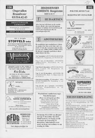 Zelfstandige verpleegkundigen: STEF KROLS, LIEVE VAN MECHELEN (03/ 315.92.29) en LIA GEERTS (03/314.81.63) JORIS BUYLE (03/314.13.08) LOU VAN BOUWEL (314.41.50) en ILSE VAN BOUWEL (03/314.80.68) VERA HAEST (03/3 14.38.39), MAY VAN DONINCK (03/314.30.48) en MAY VERMEIREN (03/315.75.48) KRIS SAENEN (03/3 14.24.39) JOHAN ADAMS (03/314.17.31) en ANJA KROLS (03/314.85.17) LIEVE ROOS (03/314.58.76)