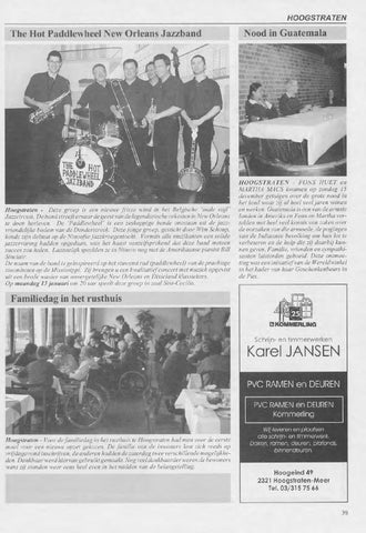 J-Ioogstraten - Deze groep is een nieuwe f'isse wind in het Belgische oude stijl' Jazzcircuit. De bandstreeti ernaar cle geest van de legendarische orkesten in New Orleans te doen her/eren. De Paddlewheel is een zeskoppige bende ontstaan uit de jazzvriendelijke bodem van de Denderstreek. Deze jonge groep, gesticht door Wim Schoup, kende zijn debuut op dc Ni,ioof.e jazzki'oegentocht. Vc'rmits ciiie muzikcinten een solide jazzervaring hadden opgedaan, was het haast vanze/f.prekencl cial deze band meteen succes zou halen. Lacitstelijk speelden ze in Ninove nog met cie A,ne,'ikaanse pianist Bill Sinclair. De naam van cie hand is ge誰nspii'eercl op het stuwend rad (p(icicllewheel) van de prcic'htige stoomboten op cie lvlississippi. Zij bm'engen ii een kwalitatief concert in et muziek opgevist uit een brede waaier van onvergelelijke New Orleans en Dixielanci klassiekers. Op mnauizdag 13 jmzuari om 20 uur speelt deze gi'oep in zaal Sint-Cccilia.