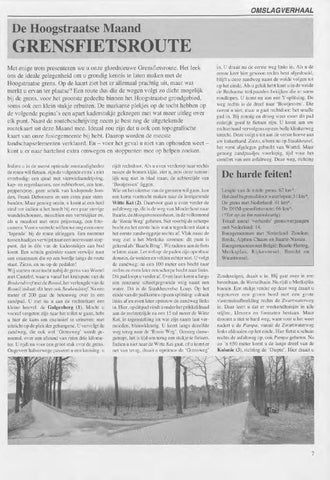GRENSFIETSROUTE Met enige trots presenteren we u onze gloednieuwe Grensfietsroute. Het leek ons de ideale gelegenheid om u grondig kennis te laten maken met de Hoogstraatse grens. Op de kaart ziet het er allemaal prachtig uit, maar wat merkt u ervan ter plaatse? Een route dus die de wegen volgt zo dicht mogelijk bij de grens, voor het grootste gedeelte binnen het Hoogstraatse grondgebied, soms ook een klein stukje erbuiten. De markante plekjes op de tocht hebben op de volgende pagina's een apart kaderstukje gekregen met wat meer uitleg over elk punt. Naast de routebeschrijving neem je best nog de uitgetekende routekaart uit deze Maand mee. Ideaal zou zijn dat u ook een topografische kaart van onze fusiegemeente bij hebt. Daarop worden de meeste landschapselernenten verklaard. En - voor het geval u niet van ophouden weet kunt u er naar hartelust extra omwegen en stoppunten mee op helpen zoeken. Indien u in de meest optimale omstandigheden de route wil fietsen, zijnde volgende extra's niet overbodig: een quad met vierwielaandrijving. kap- en regenlaarzen, een rubberhoot, een tent, pepperspray, geen schrik van loslopende honden, Frank Deboosere en een extra paar stembanden. Maar genoeg onzin, u komt al een heel eind ver indien u het houdt bij een paar stevige wandelschoenen, misschien een verrekijker en, als u meedoet met onze prijsvraag, een fotocamera. Voor u vertrekt willen we nog even onze 'legende' bij de route uitleggen. Een nummer tussen haakjes verwijst naar een interessant stoppunt, dat in één van de kaderstukjes aan bod komt. Een schuin gedrukte naam verwijst naar een straatnaam die op een bordje langs de route staat. Ziezo, en nu op de pedalen! Wij starten onze tocht nabij de grens van Wortel met Castelré, waar u vanaf het kruispunt van de Beukendreef met de Bosuil, het verlengde van de Bosuil inslaat: dit heet ook Beukendreef Na een meter of 200 gaat de betonweg over in een zandpad. U ziet nu u aan de rechterkant een kleine heuvel: de Galgenberg (1). Mocht u vooraf vergeten zijn naar het toilet te gaan, hebt u hier de kans om exclusief te urineren: met uitzicht op de plek der gehangene. U vervolgt de zandweg, die ook wel 'Grensweg' wordt genoemd, over een afstand van ruim drie kilometer. U rijdt nu voor een groot stuk over de grens. Ongeveer halverwege passeert u een kruising: u
