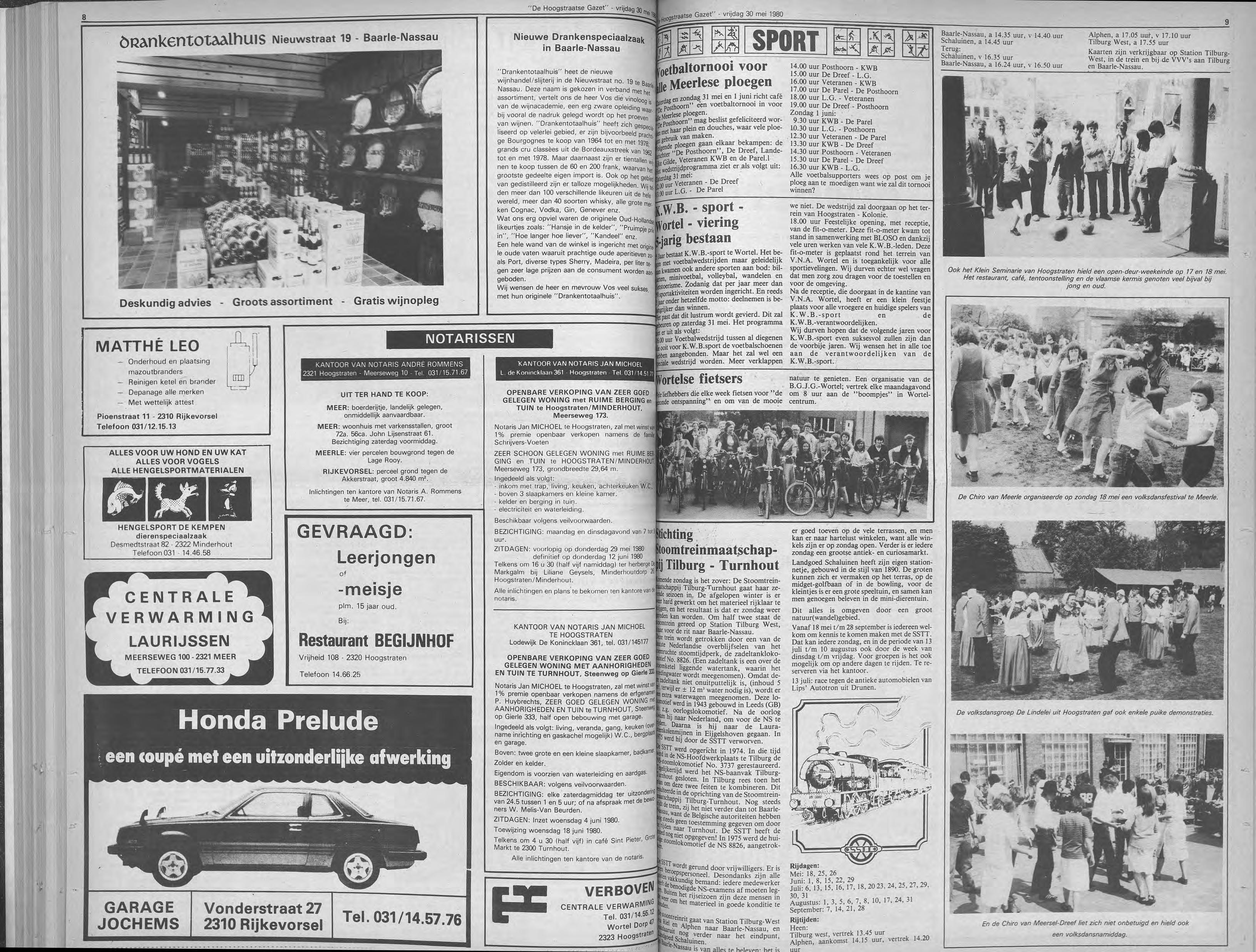 Telkens om 16 u 30 (half vijf namiddag) ter herbergeDe Markgalm bij Liliane Geysels, Minderhoutdorp 2ô, Hoogstraten Minderhout. mende zondag is hët zover: De StoomtreinAlle inlichtingen en planste bekomen ten kantore vande tschappij Tilburg-Turnhout gaat haar zede seizoen in. De afgelopen winter is er notaris, ..r hard gewerkt om het materieel rijklaarte Jgen, en het resultaat is dat er zondag weer eden kan worden. Om half twee staat de mtrein gereed op Station Tilburg West, VOor de rit naar Baarle-Nassau. e trein wordt getrokken door een van de tste Nederlandse overblijfselen van het mruchte stoomtijdperk, de zadeltanklokohefNo. 8826. (Een zadeltank is een over de �ketel liggende watertank, waarin het dmgwater wordt meegenomen). Omdat dezadel�nk niet onuitputtelijk is, (inhoud 5 Notaris Jan MICHOEl te Hoogstraten, zal met winstvan ,terwI)1 er ± 12 m' water nodig is), wordt er % premie openbaar verkopen nartiens de erfgenamen ex�ra waterwagen meegenomen. Deze loP. Huybrechts, ZEE,=:! GOED GELEGEN WONING mel Olref werd in 1943 gebouwd in Leeds (GB)