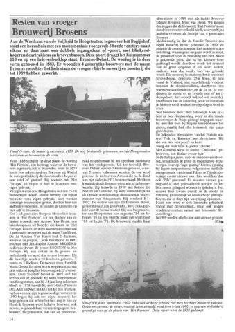 aktiviteiten in 1989 met als laatste brouwer Edgard Brosens, broer van Henri. We mogen dus zeggen dat de brouwerij 'Het Fortuin' meer dan drie eeuwen overleefd heeft, waarvan bijna anderhalve eeuw als bedrijf van 4 generaties Brosens. Merkwaardig is dat de familie Brosens een eigen mouterij bezat, gebouwd in 1890: de enige in de noorderkempen. Een mouterij is een inrichting, waarin gerst omgezet wordt in mout, de grondstof voor de bereiding van bier. Mout is gekiemde gerst, die na het kiemen weer gedroogd wordt: daardoor wordt het zetmeel van de gerst omgezet in een soort suiker, maltose, waar dan verder bier van gekookt wordt. Die mouterij bestaat nog: het is een soort torengebouw, ongeveer 25m hoog, te zien vanaf de Vrijheid, met verschillende vloeren: beneden de stookinstallatie, daarboven een warmteverdeelinrichting; op de 2e en 3e verdieping de eerste en de tweede eest of ast (droogvloer; het woord bekend uit puzzels). Daarboven van de zoldering, waar de mout van de kiemen werd ontdaan en opgeslagen werd in silo's. Wat brouwde men? Bier natuurlijk. Maar er is bier en bier. Eeuwenlang werd in alle lokale brouwerijen de 'hoge gisting' toegepast, waarbij men het bier bij hogere temperaturen liet gisten ; daarbij had elke brouwerij zijn eigen gistcultures . De bekendste biersoorten van het Fortuin waren : 'Puik' en 'Kajoeter' , met als reclame: 'Hij die van bier iets proeft en kent vraag dat men hem Kajoeter schenkt.' Met Kerstmis werd er verder 'Christmas' gebrouwen, een donker zwaar bier. In de dertiger jaren, voor de tweede wereldoorlog, schakelden de grote en middelgrote brouwerijen over op 'lage gisting' -bieren, (gisting bij lagere temperaturen) volgens een methode overgenomen van de stad Pilzen in Tsjechoslowakije, en dat nieuwe soort bier werd hier dan ook 'Pils ' genoemd. Er moesten nieuwe gistingstanks voor geïnstalleerd worden en het bier moest gelagerd worden in ijskelders. Het nieuwe bier kwam overal in de mode en verdrong gedeeltelijk de (oude) hoge gistingsbieren, die in deze tijd weer terug opkomen . Naast bier werd er ook limonade gebotteld, vooral met citroensmaak, maar ook andere vruchtenextracten, samen met bronwater St.Amelberga. In 1989 werden alle brouw-aktiviteiten gestopt. (BS)•