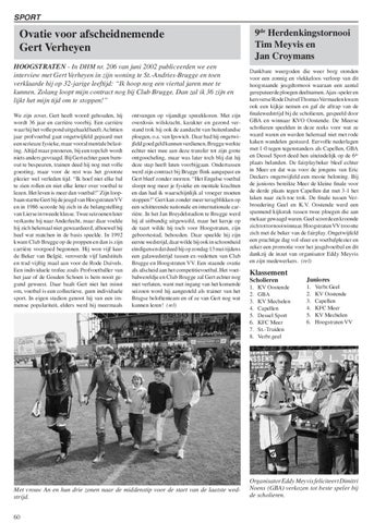 ontvangen op vijandige spreekkoren. Met zijn overdosis wilskracht, karakter en gezond verstand trok hij ook de aandacht van buitenlandse ploegen, o.a. van Ipswich. Daar had hij ongetwijfeld goed geld kunnen verdienen, Brugge werkte echter niet mee aan deze transfer tot zijn grote ontgoocheling, maar was later toch blij dat hij deze stap heeft laten voorbijgaan. Ondertussen werd zijn contract bij Brugge flink aangepast en Gert bleef zonder morren. “Het Engelse voetbal sloopt nog meer je fysieke en mentale krachten en dan had ik waarschijnlijk al vroeger moeten stoppen!” Gert kan zonder meer terugblikken op een schitterende nationale en internationale carrière. In het Jan Breydelstadion te Brugge werd hij al uitbundig uitgewuifd, maar het kersje op de taart wilde hij toch voor Hoogstraten, zijn geboortestad, behouden. Daar speelde hij zijn eerste wedstrijd, daar wilde hij ook in schoonheid eindigen en dat deed hij op zondag 13 mei tijdens een galawedstrijd tussen ex-vedetten van Club Brugge en Hoogstraten VV. Een staande ovatie als afscheid aan het competitievoetbal. Het voetbalwereldje en Club Brugge zal Gert echter nog niet verlaten, want met ingang van het komende seizoen word hij aangesteld als trainer van het Brugse beloftenteam en of ze van Gert nog wat kunnen leren! (rel)