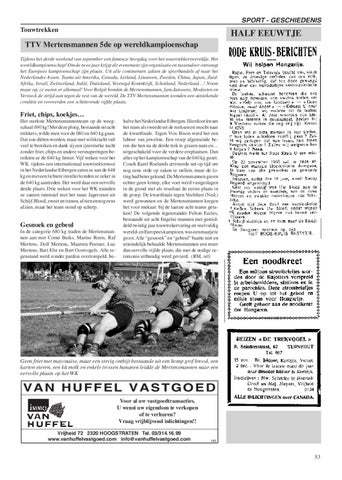 TTV Mertensmannen 5de op wereldkampioenschap Tijdens het derde weekend van september een fameuze hoogdag voor het touwtrekkerswereldje. Het wereldkampioenschap! Om de twee jaar krijgt dit evenement zijn organisatie en tussendoor ontvangt het Europees kampioenschap zijn plaats. Uit alle continenten zakten de spierbundels af naar het Nederlandse Assen. Teams uit Amerika, Canada, Letland, Litauwen, Zweden, China, Japan, ZuidAfrika, Israël, Zwitserland, Italië, Duitsland, Verenigd Koninkrijk, Schotland, Nederland…! Noem maar op, ze waren er allemaal! Voor België bonden de Mertensmannen, fam.Janssens, Modesten en Versieck de strijd aan tegen de rest van de wereld. De TTV Mertensmannen toonden een uitstekende conditie en veroverden een schitterende vijfde plaats.