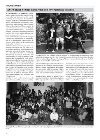 ASO Spijker bezorgt kansarmen een onvergetelijke vakantie HOOGSTRATEN/ANTWERPEN - Traditiegetrouw trokken de vijfdejaars van ASO Spijker in november naar Antwerpen en Gent voor de bezinnings- en inleefdagen. 5 Humane Wetenschappen (5HW) bezocht het Ontmoetingshuis Welzijn Stuivenberg, die aan kansarmen koffie, gezelligheid, aandacht en een wekelijkse maaltijd geven. Leerling Jolien Moonen getuigt: “Ik had veel respect voor deze mensen, dat zij zo hun verhaal durfden vertellen … Deze mensen hebben al zoveel dingen meegemaakt. Ze worden geteisterd door ziektes, relatieproblemen, geldproblemen en zoveel meer.” In een overmoedige bui beloofden de leerlingen van 5 HW aan de mensen van het ontmoetingshuis dat zij een driedaagse vakantie zouden organiseren op het Spijker, om de kansarmen hun zinnen te laten verzetten. Maar die overmoed maakte al gauw plaats voor echte daadkracht, want in de loop van de 2de trimester werd enthousiast met de voorbereiding begonnen: sponsorgeld zoeken, ideeën spuien, … Het indrukwekkendste was wellicht de ‘Smoskesslag’ in de school, waar ze met hulp van vrijwilligers op 3 uur tijd liefst 612 smoskes smeerden! Mede dankzij de mooie sponsoring in natura van Hof ter Smissen leverde dit al een bedrag van 1.000 euro op. De spaarpotjes in het Knechtjeshuis, in het kapsalon van Moeder Robeyns en bij Apotheek Horsten leverde nog eens 250 euro op. En tot hun grote verrassing kreeg 5 HW ook steun vanuit de leerlingen van het internaat. Zij organiseerden een spaghettiavond voor de ouders en verkochten pralines van deur tot deur en brachten zo ook nog eens 790 euro in kas. Maandag 31 maart was het dan zover: met de lijnbus kwamen de 19 kansarmen en hun 5 be-