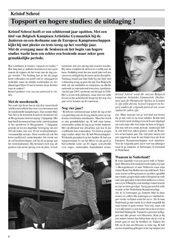Topsport en hogere studies: de uitdaging ! Kristof Schroé heeft er een schitterend jaar opzitten. Met een titel van Belgisch Kampioen Artistieke Gymnastiek bij de Junioren en een deelname aan de Europese Kampioenschappen kijkt hij met plezier en trots terug op het voorbije jaar. Met de overgang naar de Senioren en het begin van hogere studies wacht hem een echter een boeiende maar zeker geen gemakkelijke periode. Hoe combineer je immers topsport en studies ? Hoe lang kan je ambities koesteren in een sport waarin de toppers als het ware met de dag jonger worden ? En hoelang kan je het als jonge kerel volhouden om jezelf veel te ontzeggen en wekelijks naast de talrijke wedstrijden en verplaatsingen bijna 20 uur te trainen om je dromen waar te maken? Kristof probeert voor ons een antwoord te vinden.
