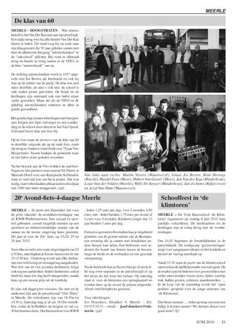 20e Avond-fiets-4-daagse Meerle MEERLE – Al jaren een klassieker net voor de grote vakantie: de avondfietsvierdaagse van de KWB-Wielertoeristen. Een sociaal én sportief gebeuren: zoveel mogelijk mensen op een sportieve en milieuvriendelijke manier van de natuur en de mooie omgeving laten genieten. Dit jaar al voor de 20e keer, op 23,24, 25 en 26 juni 2010. Voor elke avond is een route uitgestippeld van 25 à 30 km, zaterdagkan je kiezen tussen een rit van 25 of 40 km. Onderweg wordt aan elke deelnemer een verfrissing en versnapering aangeboden. Wie drie van de vier avonden deelneemt, krijgt ook nog een aandenken. Iedere deelnemer, ook al heeft hij maar één dag heeft meegereden, maakt kans op een mooie prijs uit de tombola. Er zijn ook dagprijzen voorzien. De start en de aankomst zijn aan de parochiezaal “Ons Thuis” in Meerle. De vertrekuren zijn van 18.30u tot 19.30 u. Zaterdag mag je al om 18.00u vertrekken, zodat de liefhebbers de langere rit van ca. 40 km kunnen doen. Deelnemen kost voor KWB