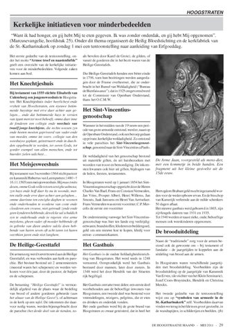 Kerkelijke initiatieven voor minderbedeelden “Want ik had honger, en gij hebt Mij te eten gegeven. Ik was zonder onderdak, en gij hebt Mij opgenomen”. (Marcusevangelie, hoofdstuk 25). Onder dit thema organiseert de Heilig Bloedstichting en de kerkfabriek van de St.-Katharinakerk op zondag 1 mei een tentoonstelling naar aanleiding van Erfgoeddag. Het eerste gedeelte van de tentoonstelling, onder het motto “Armoe troef en naastenliefde” geeft een overzicht van de kerkelijke initiatieven voor de minderbedeelden. Volgende zaken komen aan bod.