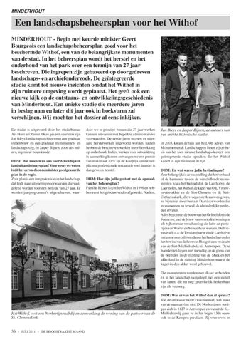 Een landschapsbeheersplan voor het Withof MINDERHOUT - Begin mei keurde minister Geert Bourgeois een landschapsbeheersplan goed voor het beschermde Withof, een van de belangrijkste monumenten van de stad. In het beheersplan wordt het herstel en het onderhoud van het park over een termijn van 27 jaar beschreven. Die ingrepen zijn gebaseerd op doorgedreven landschaps- en archiefonderzoek. De geïntegreerde studie komt tot nieuwe inzichten omdat het Withof in zijn ruimere omgeving wordt geplaatst. Het geeft ook een nieuwe kijk op de ontstaans- en ontwikkelingsgeschiedenis van Minderhout. Een unieke studie die meerdere jaren in beslag nam en later dit jaar ook in boekvorm zal verschijnen. Wij mochten het dossier al eens inkijken. De studie is uitgevoerd door het studiebureau Ars Horti uit Rumst. Onze gesprekspartners zijn Jan Bleys landschapsarchitect met een graduaat stedenbouw en een graduaat monumenten- en landschapszorg, en Jasper Bijnen, zoon des huizes, ingenieur bouwkunde. DHM: Wat moeten we ons voorstellen bij een landschapsbeheersplan? Voor zover we weten is dit het eerste door de minister goedgekeurde plan in de regio. Zo’n plan is een integrale visie op het landschap, dat leidt naar uitvoeringsvoorwaarden die vastgelegd worden voor een periode van 27 jaar. Er worden jaarprogramma’s uitgeschreven, waar-