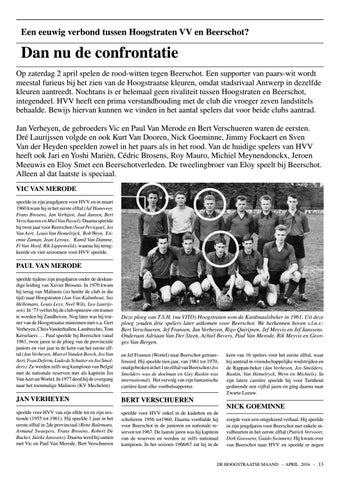Dan nu de confrontatie Op zaterdag 2 april spelen de rood-witten tegen Beerschot. Een supporter van paars-wit wordt meestal furieus bij het zien van de Hoogstraatse kleuren, omdat stadsrivaal Antwerp in dezelfde kleuren aantreedt. Nochtans is er helemaal geen rivaliteit tussen Hoogstraten en Beerschot, integendeel. HVV heeft een prima verstandhouding met de club die vroeger zeven landstitels behaalde. Bewijs hiervan kunnen we vinden in het aantal spelers dat voor beide clubs aantrad. Jan Verheyen, de gebroeders Vic en Paul Van Merode en Bert Verschueren waren de eersten. Dré Laurijssen volgde en ook Kurt Van Dooren, Nick Goeminne, Jimmy Fockaert en Sven Van der Heyden speelden zowel in het paars als in het rood. Van de huidige spelers van HVV heeft ook Jari en Yoshi Mariën, Cédric Brosens, Roy Mauro, Michiel Meynendonckx, Jeroen Meeuwis en Eloy Smet een Beerschotverleden. De tweelingbroer van Eloy speelt bij Beerschot. Alleen al dat laatste is speciaal. VIC VAN MERODE speelde in zijn jeugdjaren voor HVV en in maart 1960 kwam hij in het eerste elftal (Ad Haneveer, Frans Brosens, Jan Verhijen, Juul Jansen, Bert Verschueren en Miel Van Passel). Daarna speelde hij twee jaar voor Beerschot (Swat Persigael, Jos Van Aert, Louis Van Hemelrijck, Bob Weyn. Etienne Zaman, Jean Leroux, Kamil Van Damme, Fi Van Hoof, Rik Lippenveld), waarna hij terugkeerde en vier seizoenen voor HVV speelde.