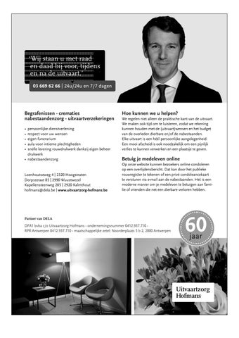 Loenhoutseweg 4 | 2320 Hoogstraten Dorpsstraat 85 | 2990 Wuustwezel Kapellensteenweg 205 | 2920 Kalmthout hofmans@dela.be | www.uitvaartzorg-hofmans.be