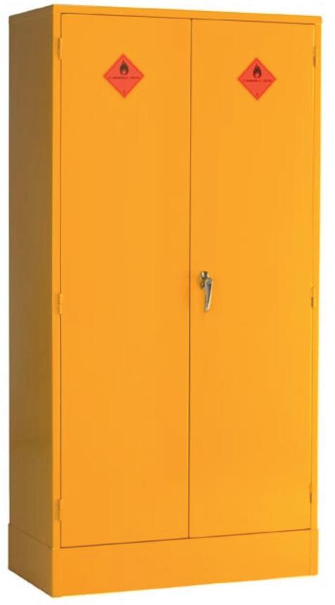 Manufactured in 20 gauge mild steel with welded seams, this cabinet is fitted with reinforced non-combustible doors, with high melting point hinges, and lockable 'L' handle with 2 point locking system. Two keys are supplied. It comes with 3 adjustable shelves which act as a spillage tray for minor spills and are adjustable in 25mm increments. There is an internal spillage sump built into the base of the unit which is not removable. The cabinet is finished in yellow polyester powder coat with warning labels on the doors. Other sizes are available online.