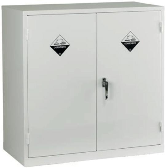 Manufactured in 20 gauge mild steel with welded seams, this cabinet is fitted with reinforced non-combustible doors, with high melting point hinges, and lockable 'L' handle with 2 point locking system. Two keys are supplied. It comes with 1 adjustable shelf which acts as a spillage tray for minor spills and is adjustable in 25mm increments. There is an internal spillage sump built into the base of the unit which is not removable. The cabinet is finished in white polyester powder coat with warning labels on the doors. Other sizes are available online