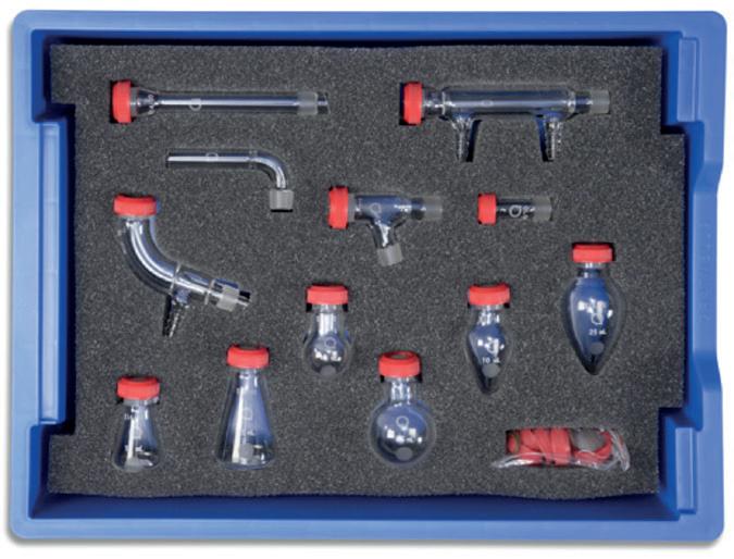 The Quickfit® Microscale Chemistry Kit was designed to perform organic chemistry experiments, but on a much smaller scale. Most standard organic chemistry sets may be performed using this set. The main benefits are: cheaper (reduced solvent costs), safer (smaller amounts of chemicals and no Bunsen burners required), quicker (reduced times for experiments), versatile (many assemblies can be constructed - reflux, distillation, fractional distillation etc.) and easy to assemble (combination of standard Quickfit® ground glass joints and sealing ‘O’ rings and plastic screwcaps). Dimensions (L x W x D): 40 x 25 x 20 cm (unpacked). Contents: • Air condenser • Drying tube • Still head • Jacketed condenser • Thermometer adapter • 25 mL Pear shaped flask • 10 mL Pear shaped flask • Bag of spare caps, seals and ‘O’ rings • 25 mL Round bottom flask • 10 mL Round bottom flask • 10 mL Erlenmeyer flask • 25 mL Erlenmeyer flask • Receiver