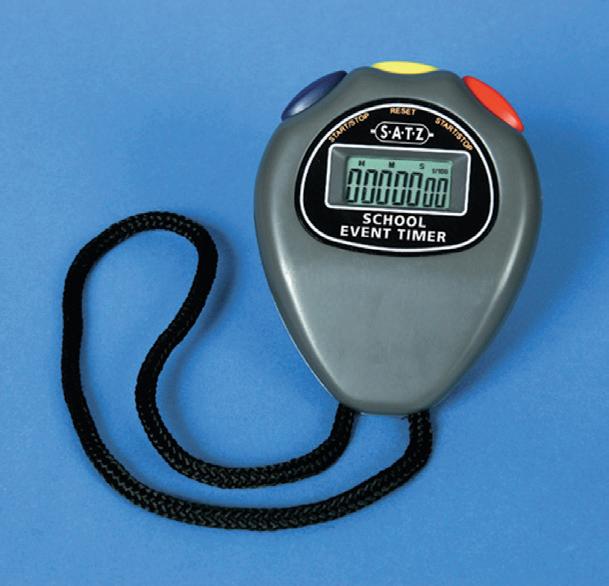 A heavy duty digital stopwatch designed specifically for school use, with large captive buttons, lap and split time facilities and no alarm, chime or clock functions. Capacity: 9 hrs, 59 mins, 59 secs. Resolution 1/100th sec. Supplied with SR44 cell.