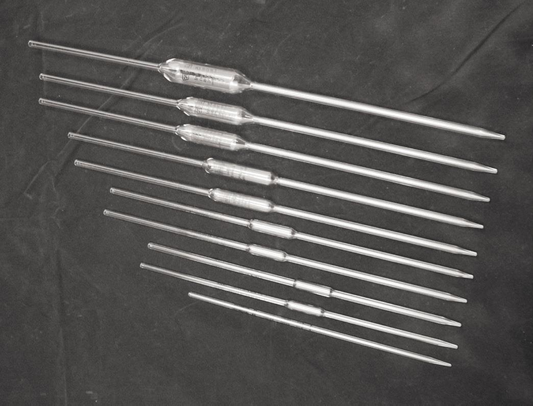 One mark bulb pipettes for dispensing a set volume of liquid. Accuracy 0.2 % and manufactured to BS 1583.