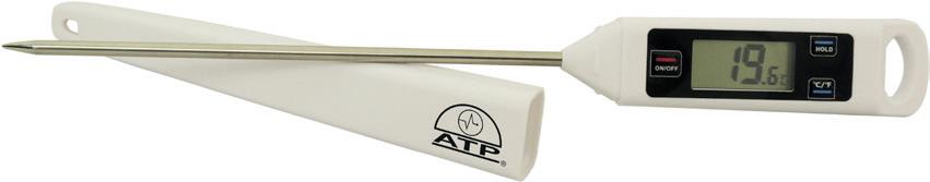 A pen-type thermometer with a 120 x 4 mm stainless steel probe, ABS plastic head with a clear LCD and two function switches on/off and test/hold. Accuracy: ± 1 °C (within range -20 - 120 °C). Range: -50 to 150 x 0.1 ºC. Supplied with pocket case and SR44 battery.