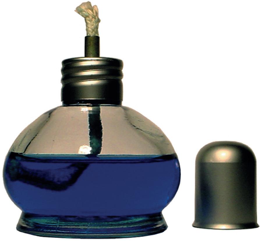 Glass body with wick, screw on top and push on cap.