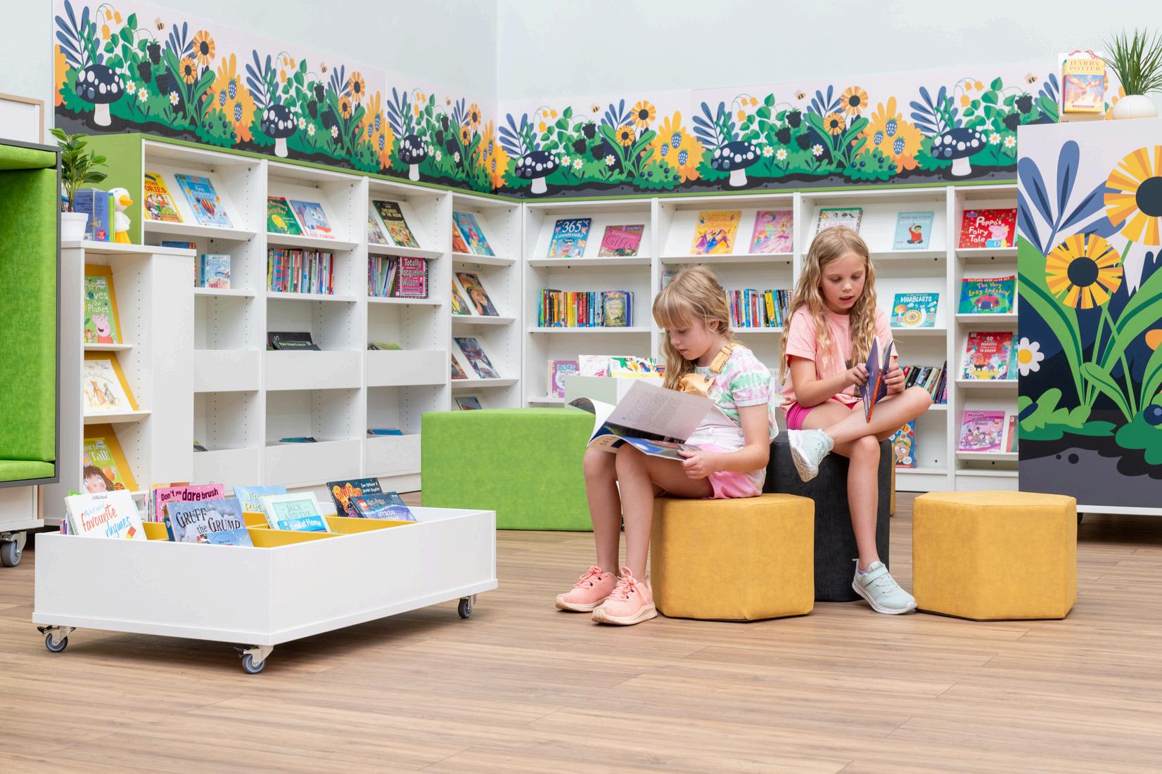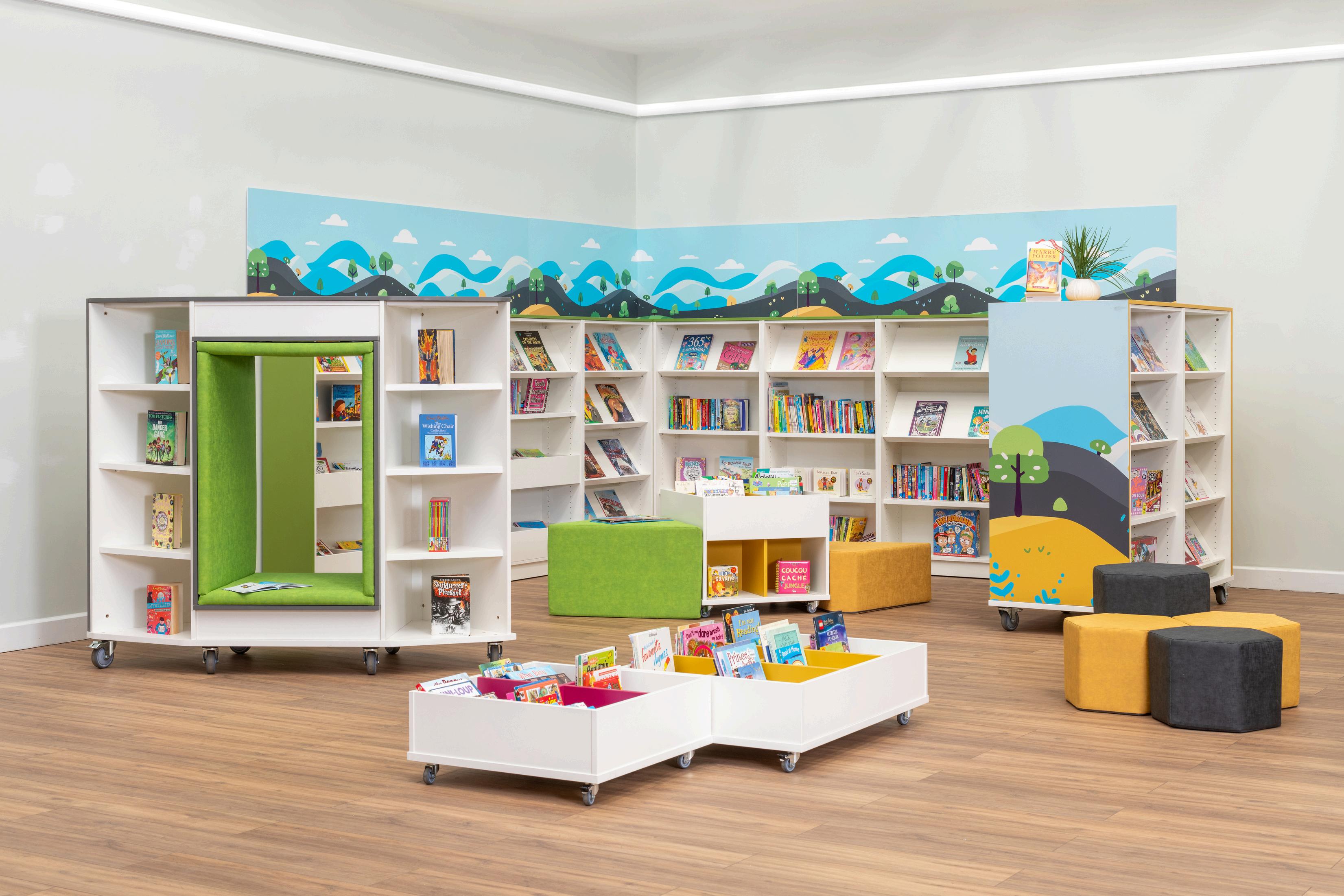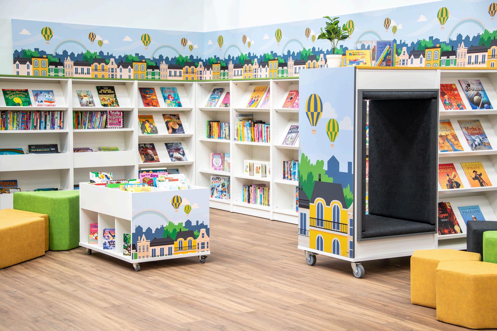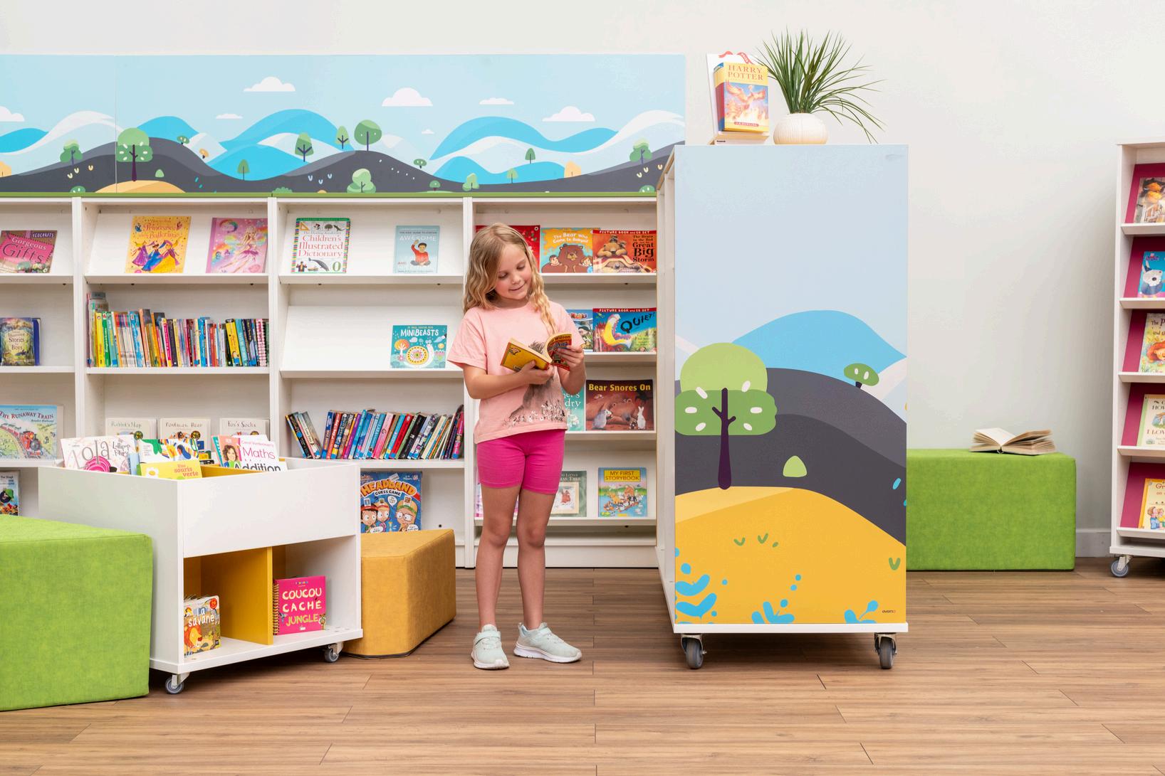 Investir dans le graphisme de votre bibliothèque peut considérablement encourager les enfants à lire pour le plaisir. Les stimuli visuels jouent un rôle crucial pour capter l'attention des jeunes lecteurs et leur donner le goût des livres. Des graphismes vibrants sur les meubles mobiles et les murs transforment la bibliothèque en un environnement accueillant et dynamique. Ces visuels colorés peuvent créer des espace de lecture thématiques, rendant la bibliothèque plus attrayante et moins intimidante pour les enfants.