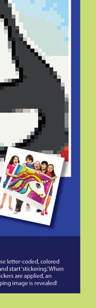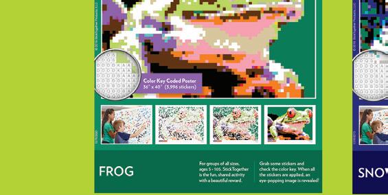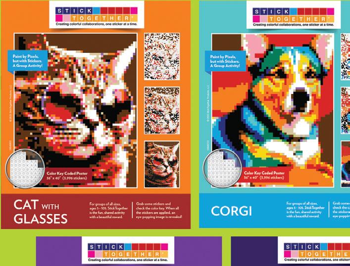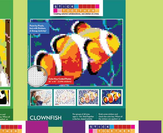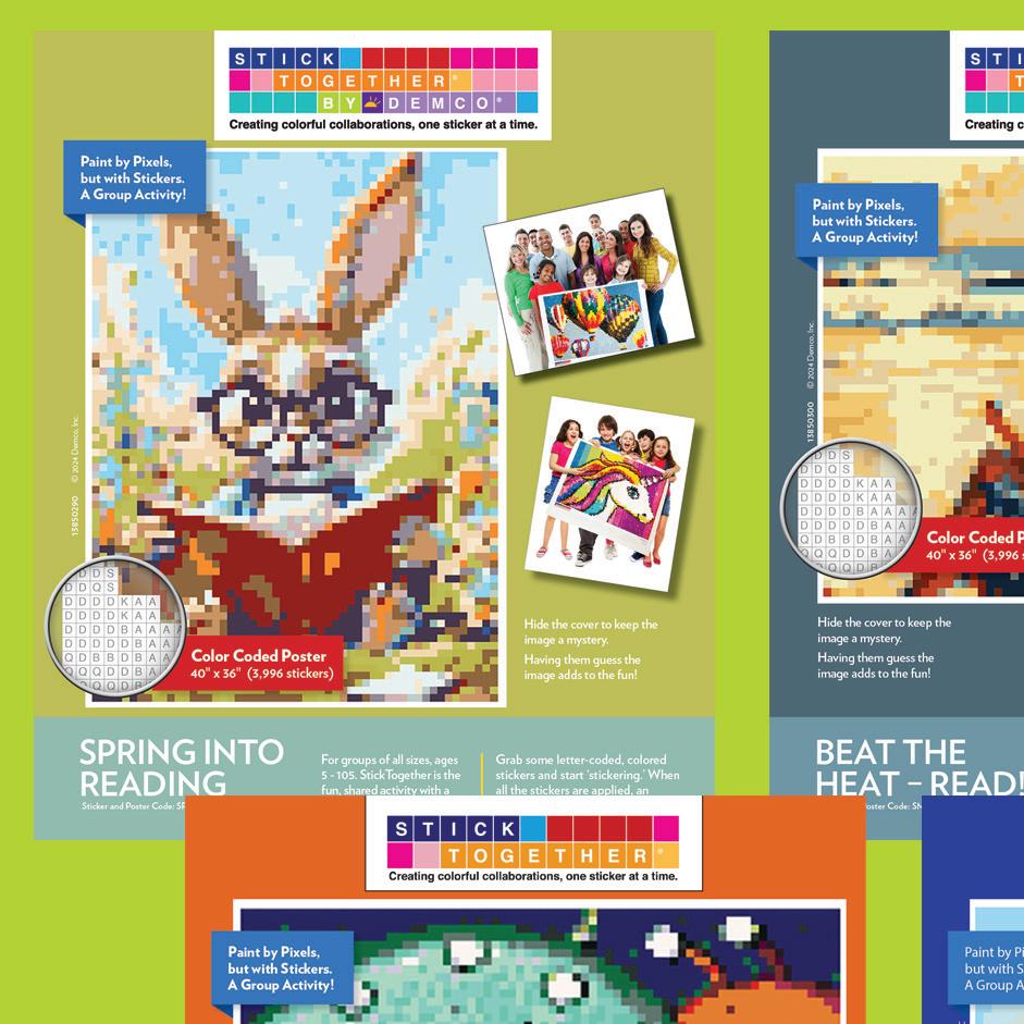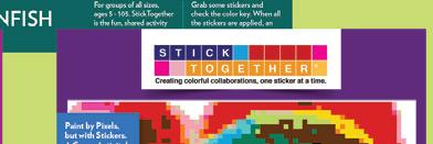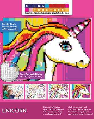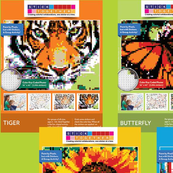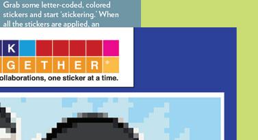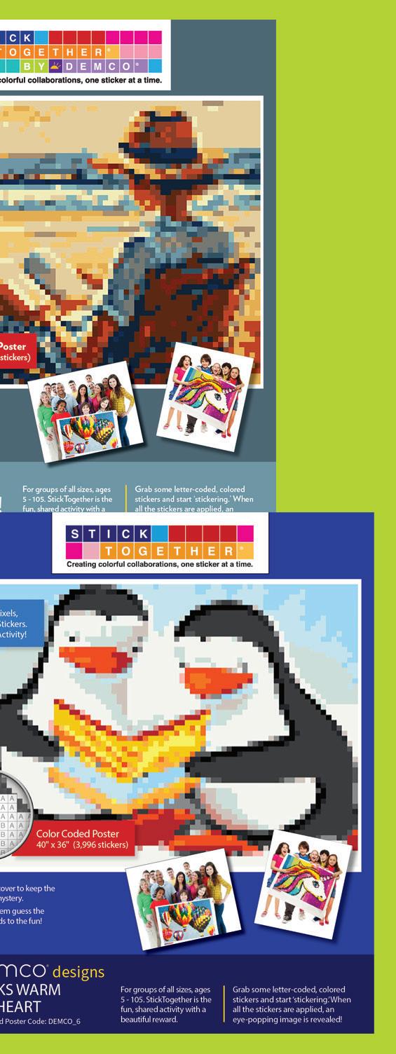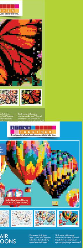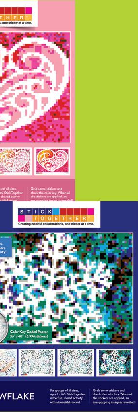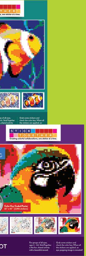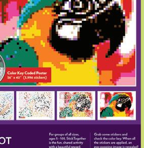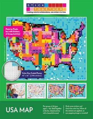 A colorful mosaic activity with beautiful results StickTogether brings people together to create eye-catching posters made up of 1⁄2" square stickers. Each kit includes everything you need to get started with groups of all ages. They’re a great addition to makerspaces, community-building events, classroom competitions, reading challenges, and more. Standard posters are 40" x 36" with 3,996 stickers.