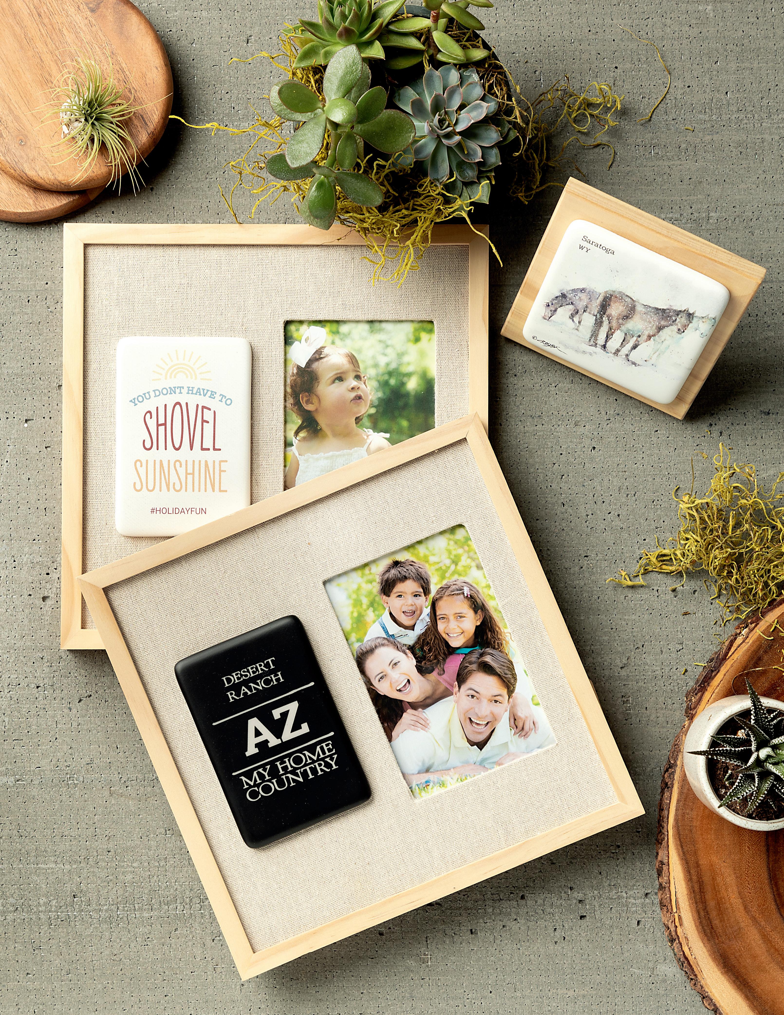 • Pine wood ornaments hold a 2x2 photo of your favorite travel memory