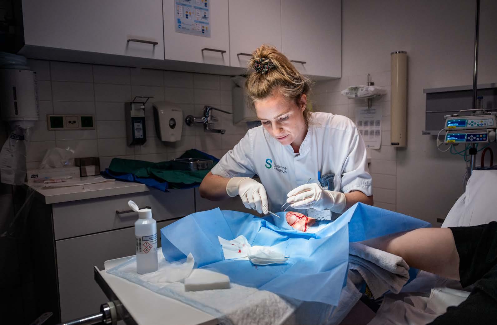 Maandagavond op de seh van het Spaarne Gasthuis in Haarlem Zuid. Het is warm, vakantietijd, en de drukte is voelbaar. Toeristen vinden hun weg naar de afdeling, ambulancepersoneel loopt in en uit. Het hart van de seh is de hele avond gevuld met artsen, verpleegkundigen, coassistenten en anios die elkaar bijpraten, dossiers bijwerken en de stroom patiënten coördineren. Chirurg i.o. Kirsten Dabekaussen draait mee in de hectiek. Haar eerste patiënt: een vrouw met een open enkelbreuk na een val van de e-bike. Terwijl ze zich over het plan voor repositie buigt, rinkelt de telefoon meerdere malen. Huisartsen willen spoedgevallen overleggen, collega’s stellen tussendoor vragen. Op de gang spreekt de coassistent die met haar meeloopt haar aan; even later staat ze alweer bij een patiënt op zaal die veel pijn heeft. Ondanks de drukte houdt Kirsten het overzicht en blijft ze kalm en vriendelijk. Ze onthoudt alles wat haar wordt toegespeeld en schakelt soepel tussen een polsbreuk, een mogelijke heupfractuur en een patiënt die van de trap is gevallen. Er is zelfs tijd voor een grapje in het Duits met een toerist die door zijn eigen hond is gebeten. Terwijl de man zich vooral zorgen maakt om zijn huisdier, behandelt zij geconcentreerd de wond. De avond is nog lang niet voorbij. Samen met traumachirurg Martin Heetveld bespreekt ze het operatieplan voor een complexe botbreuk. ‘Oh, en de administratie moet ook nog afgerond worden’, zegt ze monter. Maar nog voordat ze daarmee verder kan, meldt de volgende patiënt zich alweer.