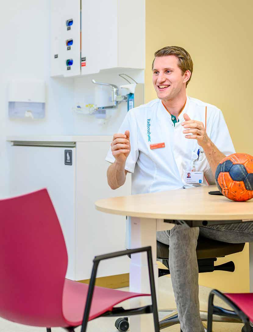 WERK Voor eredivisiehandbal ben je snel te oud. Jammer? Ja en nee, want kinderarts in opleiding Thijs Geurds (30) krijgt meer tijd voor het voorzitterschap van DFS Arnhem, vrienden, familie en werk. Hij voelt zich kinderarts tot in zijn diepste - ruim twee meter lange - wezen. Als Grote Vriendelijke Reus maakt hij gemakkelijk contact met zijn jonge patiënten. Het mooie van kindergeneeskunde: de holistische kijk op het kind en als team op weg naar de beste oplossing. Altijd op zoek naar wat er wél kan, zo opereert Thijs. Daarmee geeft hij dat extra zetje om ook hier een punt te kunnen maken. ‘Dit valt me op…’, zei hij pas over de infuussamenstelling. Het was de opmaat naar verbetering.