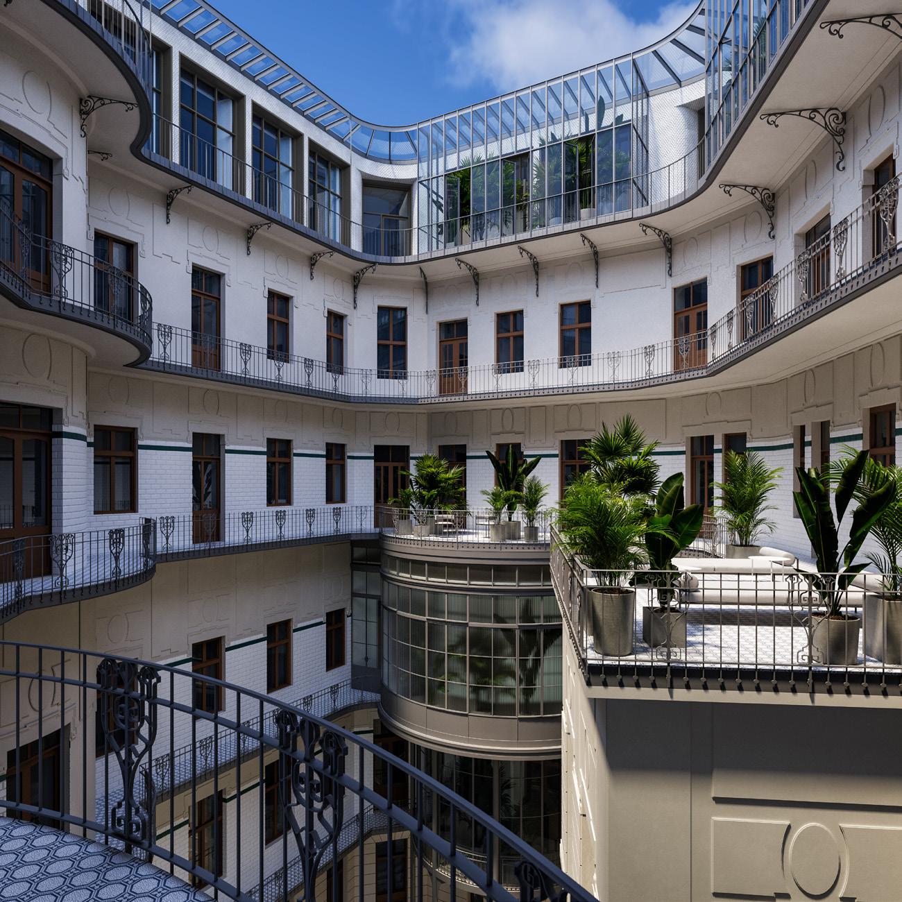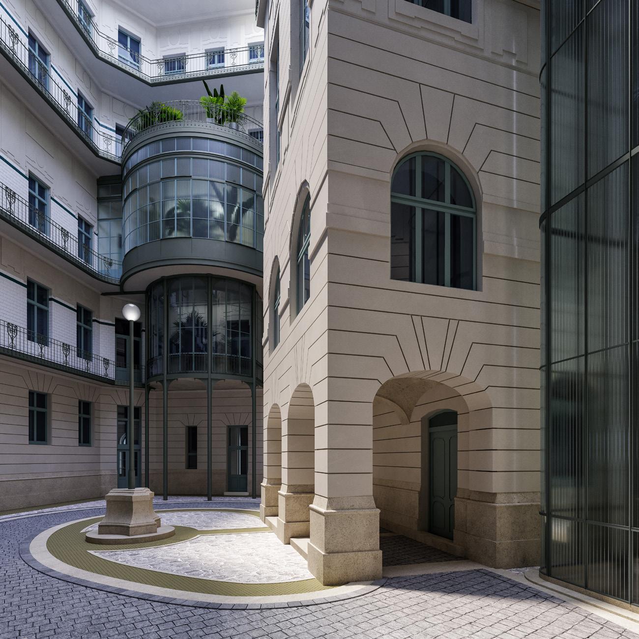 Az új épületrészek a palota belső udvarában tűnnek fel. Az épületre jellemző barokkos extravagancia, a formák, a kompozíció és a használt anyagok pazar sokfélesége mértékadó volt a bővítmények karakterének megfogalmazásában. Az orangerie hasasodó, fém-üveg tömegének mintázatát követik a kültéri lift illetve tetőtéri lakások télikertjei, úgy az anyaghasználat és formavilág, mint a tartószerkezetekhez való viszonyulás tekintetében. A függőfolyosók rendszere folytatódik az új szinten is azzal a különbséggel, hogy a kis szögű törések helyett finoman ívelt a vonalvezetése. A homlokzati kerámiaburkolat az alsóbb szinteken is megjelenő, szokatlan anyagválasztást követi, melynek előnye, hogy a zománcos felületről visszaverődő fény mélyen behatol az amúgy kedvezőtlen fényviszonyokkal bíró belső udvarba.