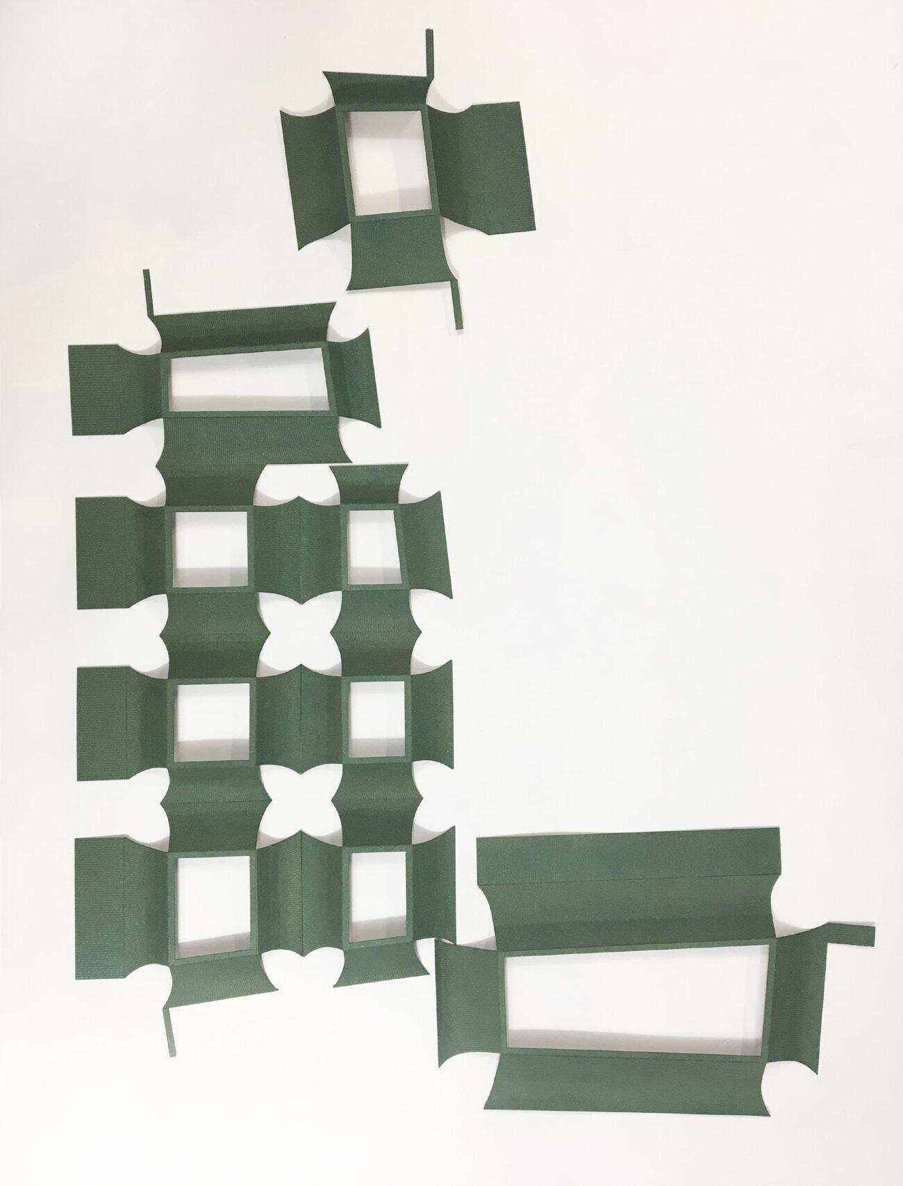 The large spaces of the first floor have high roof volumes, embracing the complex lighting installations of museum celings filtering natural light. Covered with vibrant green copper profiles, the large roofs overhang the white, ribbed glass volume of the two floors. Falling like pleated skirts these roofs form canopies underneath them, marking the covered terrace of the café, and some parts of the path surrounding the building.