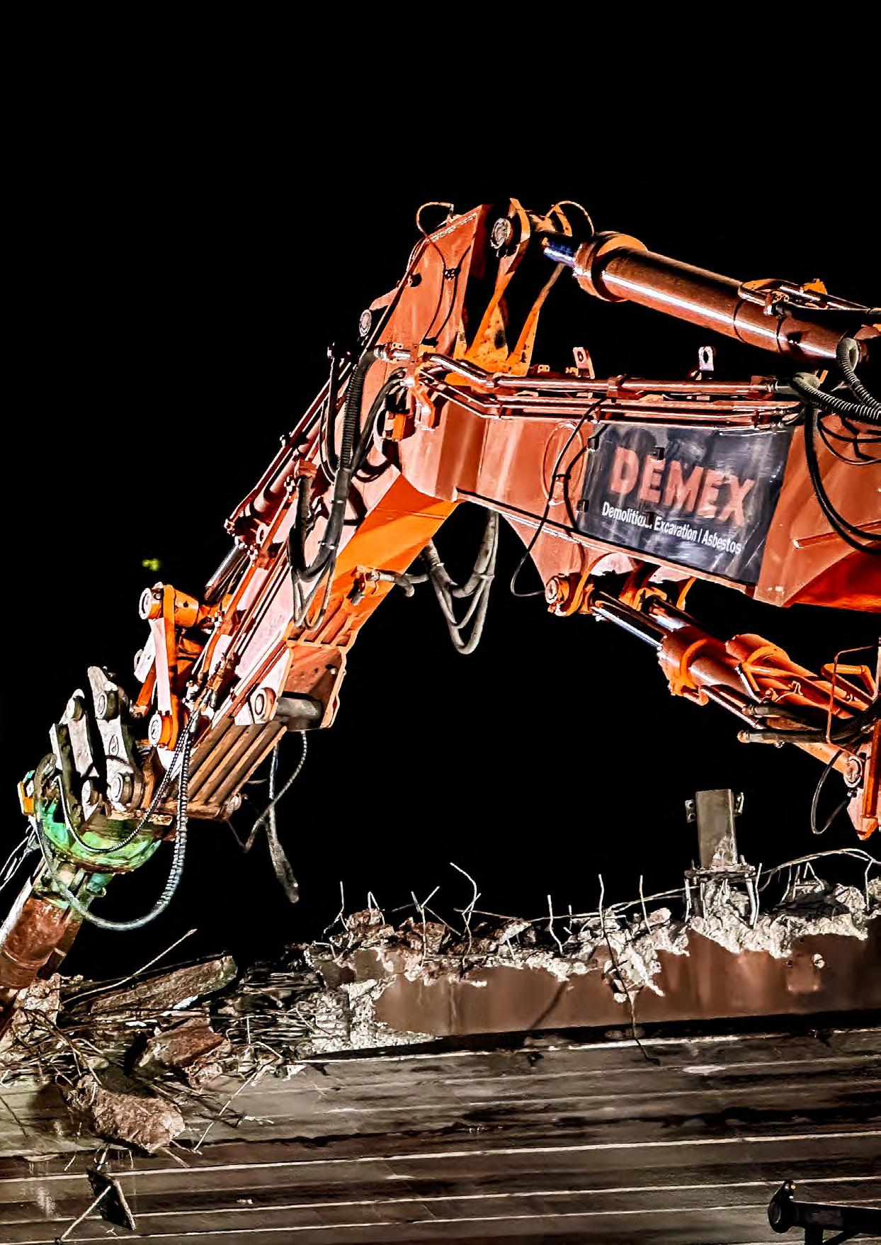Complete and partial structures (internal and external), bridges, structures at height, multi-level structures, detailed and intricate demolition, and high risk demolition requiring specialised machinery and project management.