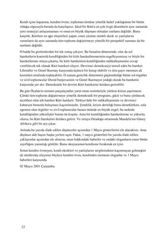 Kendi içine kapanma, kendini övme, toplumun tümüne yönelik hedef yokluğunun bir bütün olduğu olgusuyla burada da karşılaşırız. Đdeal bir Kürt'e en çok övgü düzenlerin aynı zamanda yeni stratejiyi anlayamaması ve onun en büyük düşmanı olmaları rastlantı değildir. Buna karşılık, Kürtlere en ağır eleştirileri yapan, onun yüzüne sürekli eksik ve yanlışlarını vuranların da aynı zamanda tüm toplumu değiştirmeye yönelik bir perspektif sunması da bir rastlantı değildir. O halde bu gözlemlerden bir tek sonuç çıkıyor. Bu bunalım döneminde, olur da sol hareketlerin kontrolü kendiliğinden bir kitle hareketlenmesinin engelleyemezse ve böyle bir hareketlenme ortaya çıkarsa, bu kitle hareketinin kendiliğinden radikalleşmesine cevap verebilecek tek olanak Kürt hareketi oluyor. Devrimci demokrasiyi temsil eden bu hareket Liberaller ve Genel Kurmay karşısında üçüncü bir kutup olabilir ve tüm gayrı memnun alt kesimleri etrafında toplayabilir. O zaman gericilik döneminin güçlendirdiği bütün sol örgütler ve sivil toplumcular liberal burjuvazinin ve Genel Kurmayın yedeği olarak bu hareketin karşısında yer alır. Demokratik bir devrim Kürt hareketini iktidara getirebilir. Bu gün Öcalan'ın resmini parçalayanlar yarın onun resimleriyle yürürse kimse şaşırmasın. Çünkü tüm toplumu değiştirmeye yönelik demokratik bir programı, gücü ve bunu yürütecek tecrübesi olan tek hareket Kürt hareketi. Türkiye'deki bir radikalleşmenin ve devrimci kabarışın bununla buluşması kaçınılmazdır. Şimdilik, krizin derinliği bunu desteklerken, sola egemen olan örgütler ve sivil toplumcular bunun önünde en büyük engel, bu nedenle kendiliğinden yükselişler bunun ön koşulu. Ama bir kendiliğinden hareketlenme ve yükseliş olursa, bu Kürt hareketini iktidara getirir. Ve ortaya Ortadoğu ortamında Mandela'nın Güney Afrika'sı gibi bir şey çıkar. Aslında bu yazıda ifade edilen düşünceler açısından 1 Mayıs gösterilerini ele alacaktım. Ama düşünce aldı başını başka yerlere uçtu. Fakat, 1 mayıs gösterileri bu yazıda ifade edilen yaklaşımlar açısından ele alınırsa, onun hakkındaki haberler ve ondaki sloganların onun bütün zayıflığını yansıttığı görülür. Bunu okuyucunun kendisine bırakmak en iyisi. Solun kendini övmeyen, kendi eksikleri ve yanlışlarını sergilemekten kaçınmayan geleneğini de sürdürmüş oluyoruz böylece kendini öven, kendinden memnun sloganlar ve 1 Mayıs haberleri karşısında. 02 Mayıs 2001 Çarşamba