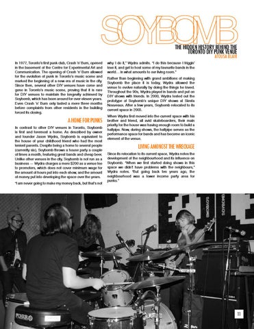 Living Amongst the Wreckage Since its relocation to its current space, Wydra notes the development of the neighbourhood and its influence on Soybomb. “When we first started doing shows in this space we didn’t have problems with the neighbours,” Wydra notes. “But going back ten years ago, the neighbourhood was a lower income party area for punks.”