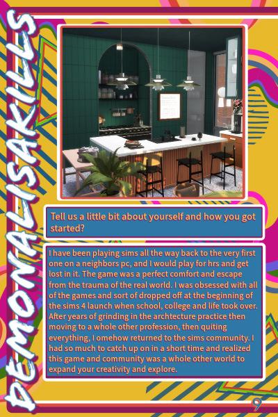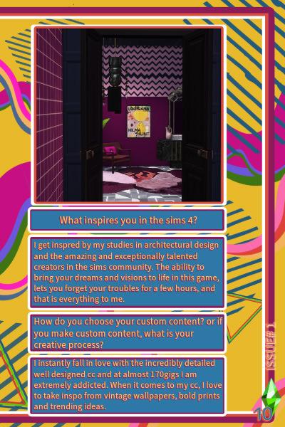 I would say that most of my inspiration comes from real life, but Sims is the vehicle that allows me and others to express themselves as they choose. I love seeing how creative the community of players can be. Sims was such a huge part of my childhood, it grew up with me, moved continents with me, entertained me, etc. and there really isn't another game like it that o昀昀ers the amount of freedom to customize.