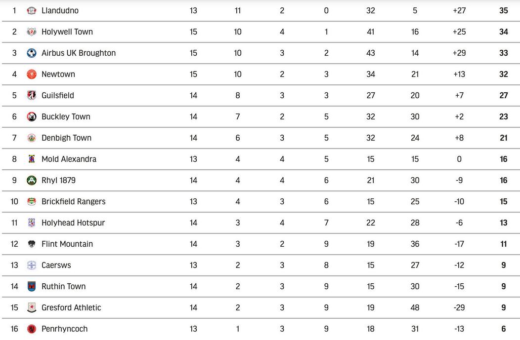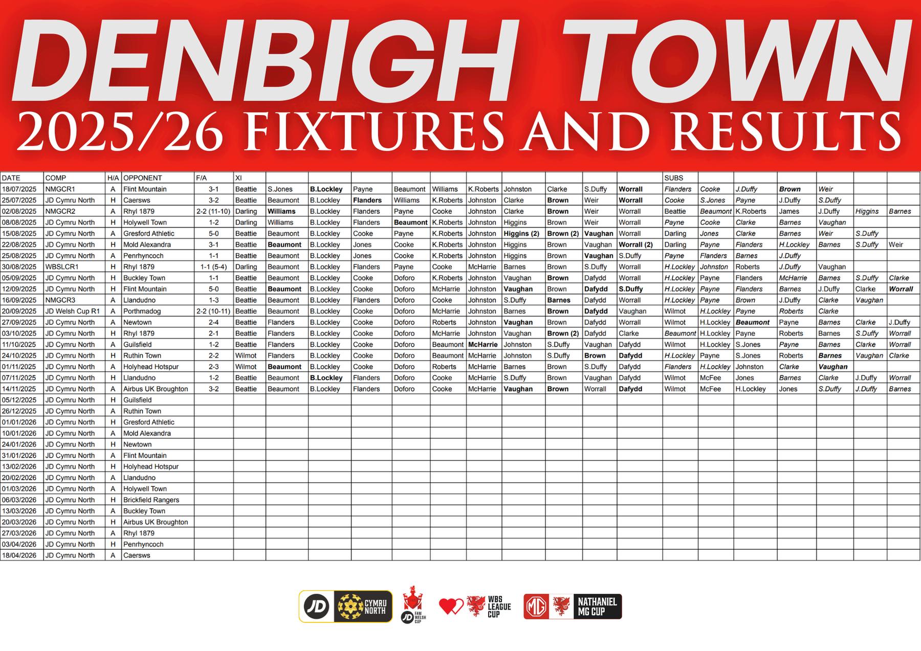 Denbigh Town: Beattie, Flanders, Doforo, Beaumont, Lockley, Cooke, McHarrie, Johnston, S Duffy, Vaughan, Dafydd