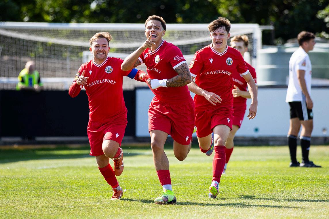 Denbigh’s first foray into the Robins half on 18 minutes saw Nathan Doforo’s low cross just out of reach of Vaughan before Luke Johnston was hacked down on the edge of the box and resulting free kick thrashed wide by Nathan Brown