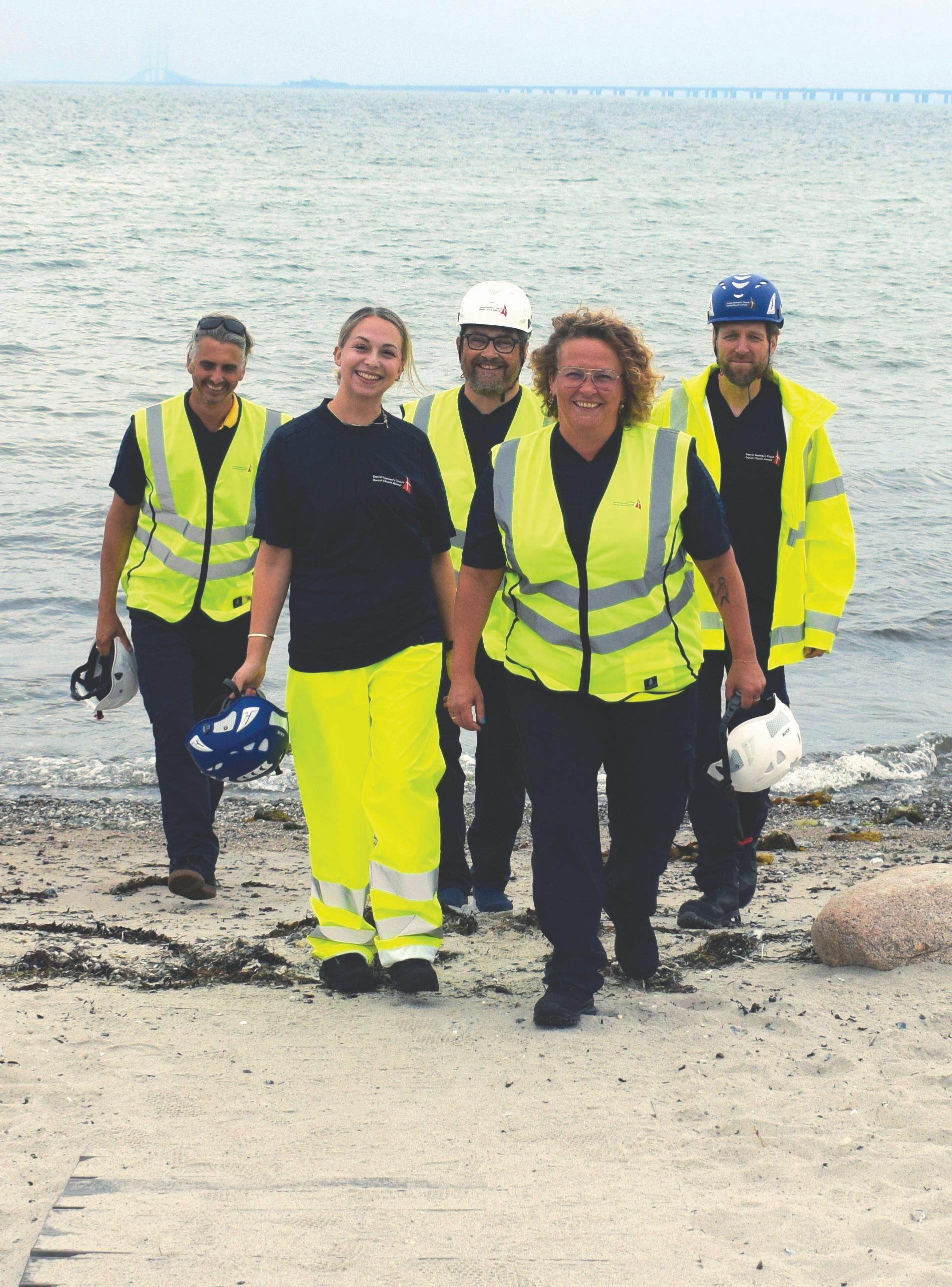 ”Som I kan se af billedet, så har vi fået nyt arbejdstøj. Via en flot donation har DSUK kunnet indkøbe nyt tøj, nye sikkerhedssko og det nødvendige sikkerhedsudstyr til alle sømandspræster og assistenter. Nu er vi alle iklædt moderne sikkerhedstøj, som opfylder de gældende sikkerhedsregler, og vi er alle ens påklædt med DSUK’s logo, så de søfarende kan genkende os, når vi møder dem på havnen i Hong Kong, Gøteborg, Singapore, Pelepas, Algeciras, Rotterdam eller Hamborg.”