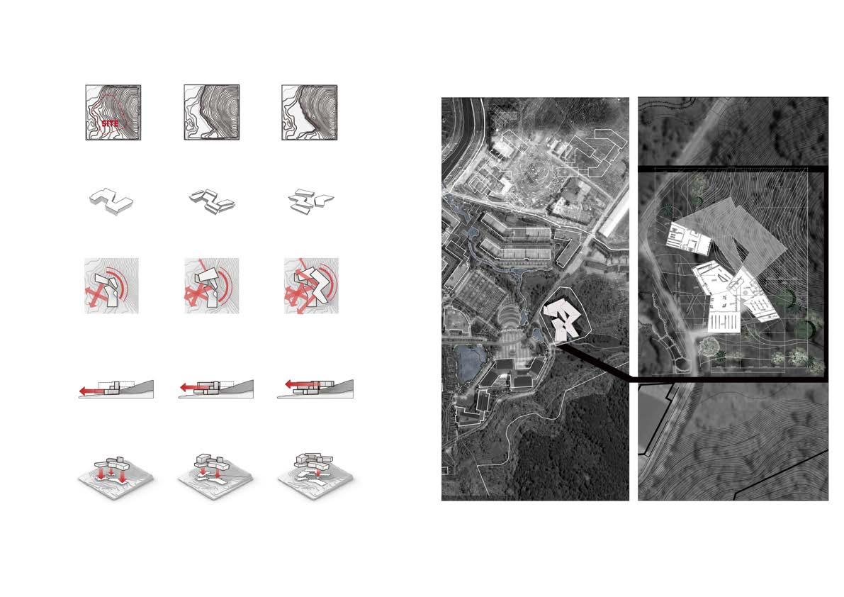 The overall trend of the building continues the mechanism of the surrounding buildings, combined with the special terrain of the mountain, drawing lessons from the treatment of the facade of the old library; In space, a continuous rhythmic space is formed by referring to the scattered and stacked layers of mountains, and the environment is integrated into the building through reasonable treatment of the mountainous terrain. The horizontal space of the building divides the interior through functions, and connects each space with stairs and ramps, extending the space and making the whole space form a continuous change. The vertical space connects the reading rooms and the lobby through the courtyard and the stairs beside it, forming a distinct and rich interior space. The outdoor area provides students with a good outdoor activity area by introducing a mountain stream, placing a small bridge, platform and outdoor desk.
